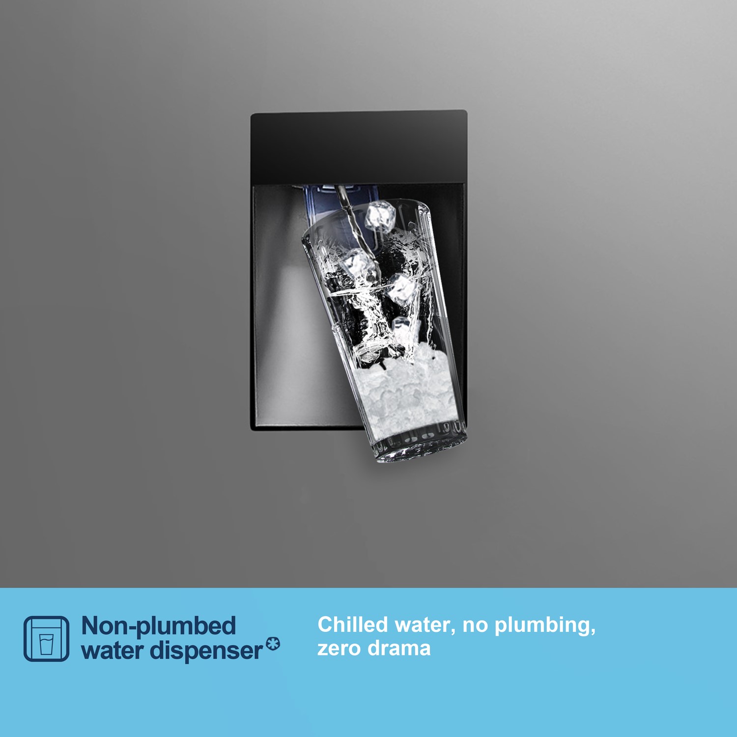 This fridge freezer from Fridgemaster is the perfect home for your weekly shop. Its 256 litre capacity can hold up to 13 bags of food shopping – everything from your bottles of milk for those morning brews, to your frozen pizzas for Saturday movie night. There’s even a non-plumbed water dispenser so a refreshingly chilled beverage is only a moment away. Because this is a Total No Frost model, you won’t ever need to waste your time chipping away at pesky ice crystals either, as cold air is circulated to keep them at bay. And with doors that can be switched to open either from the left or right, finding the ideal spot for you new appliance is straightforward too.