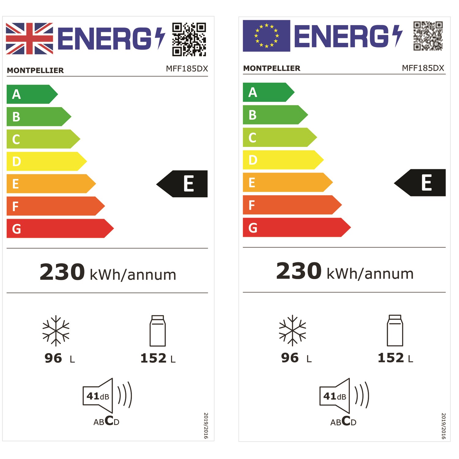 - E Energy rating to save you money off your utility bills (230 kWh/year)