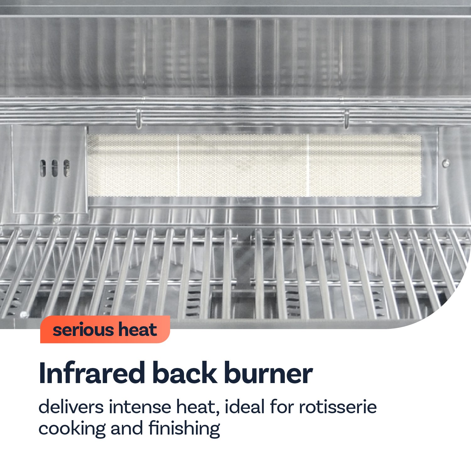 Delivers intense heat, ideal for rotisserie cooking and finishing.