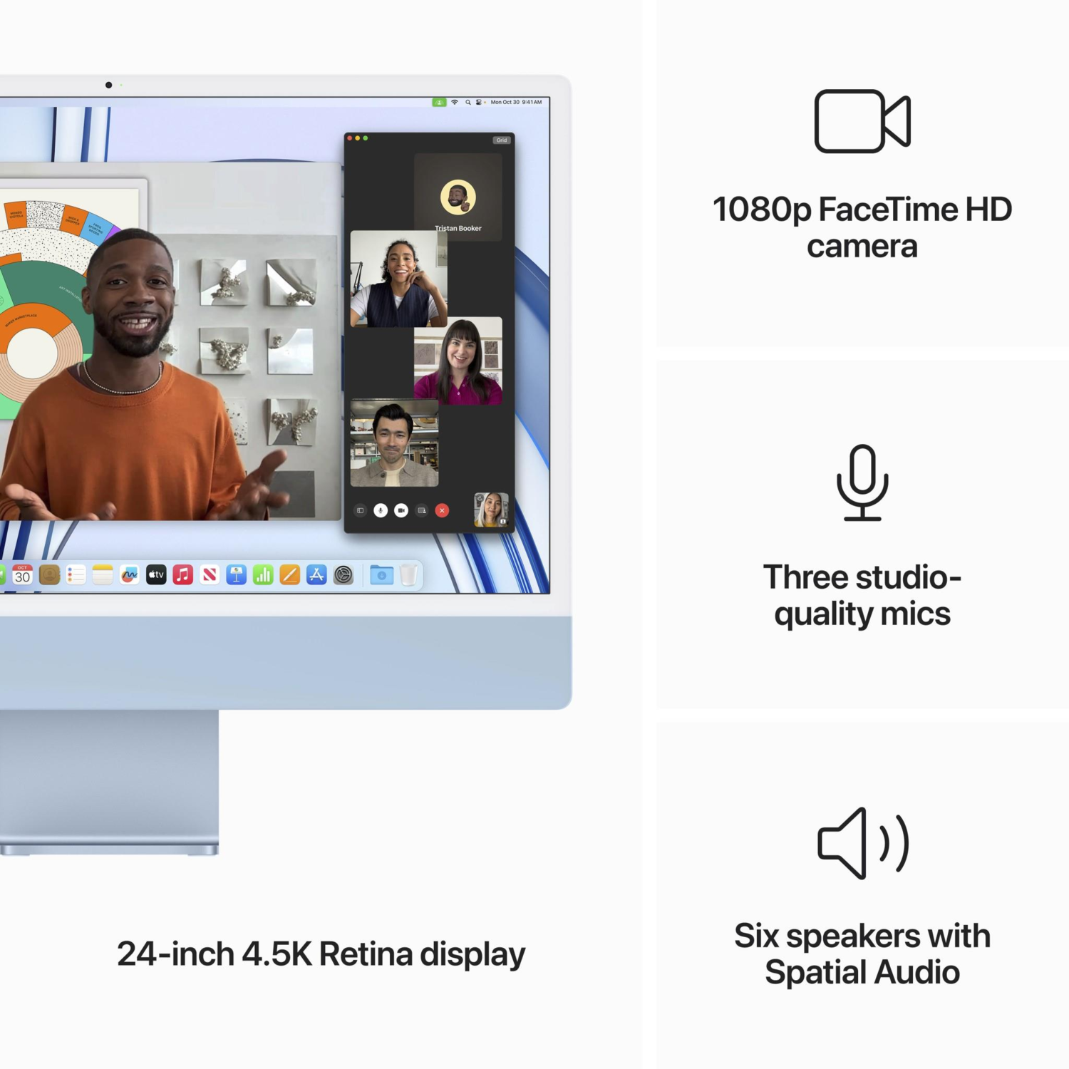 Experience the ultimate iMac camera system. The M3 chip's image signal processor enhances image quality by analysing pixels at over a trillion operations per second, reducing noise, improving dynamic range, and providing more balanced exposure. Presenter Overlay keeps you in the spotlight during video calls.