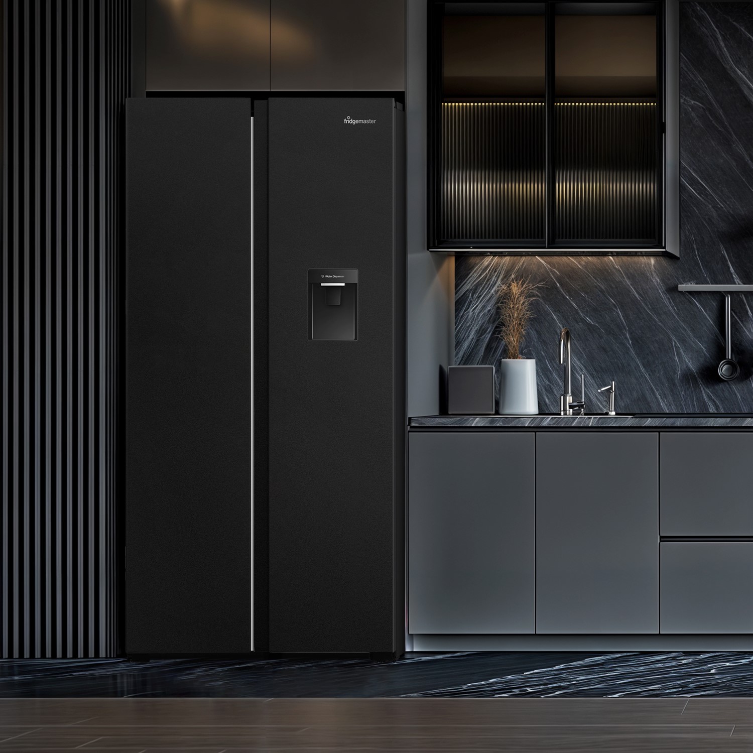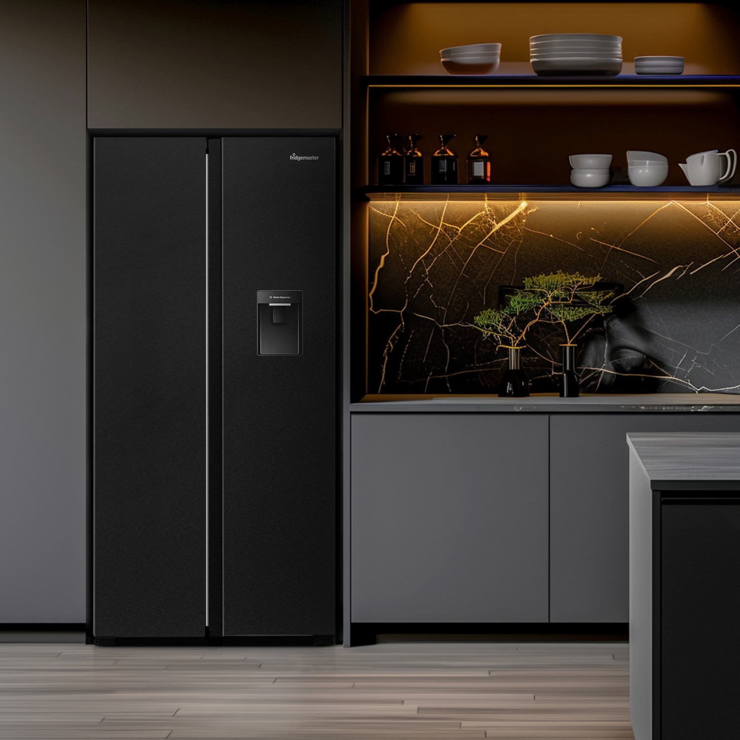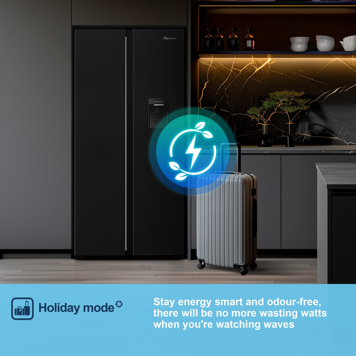 Meet your kitchen’s new best mate - the Fridgemaster American Side-by-Side Fridge Freezer. With room for 22 bags of shopping and chilled water on tap without any plumbing needed, it’s made for busy lives and hungry bellies. No more defrosting thanks to clever Total No Frost tech, and Super Cool and Super Freeze swoop in to keep your food fresh and flavours doing a little happy dance. Quiet, energy-smart, and lit up with bright but gentle LED lighting, it’s packed with handy extras like Holiday Mode to keep things fresh while you’re off sunning yourself. Easy, breezy, and brilliantly brilliant.
