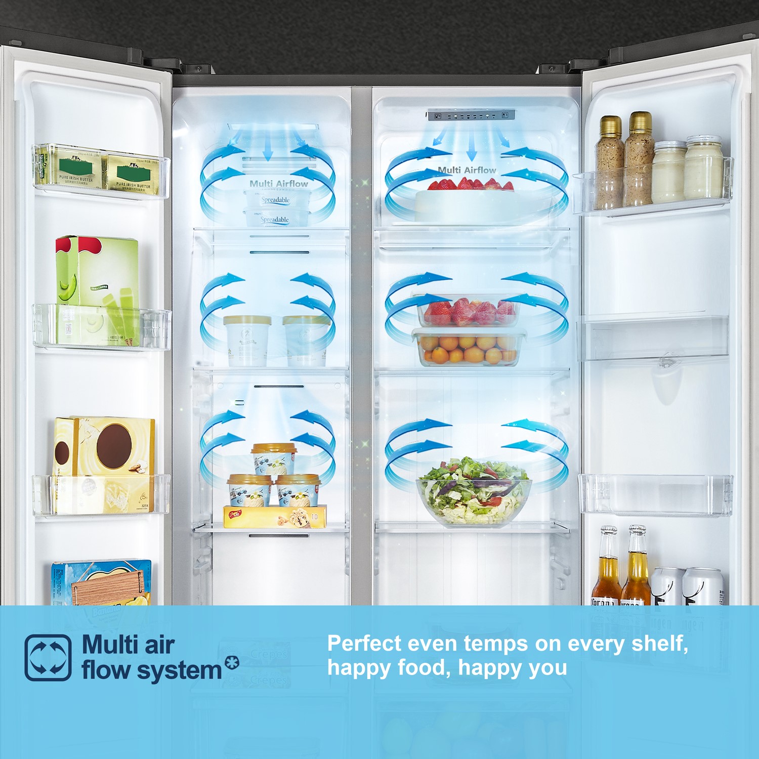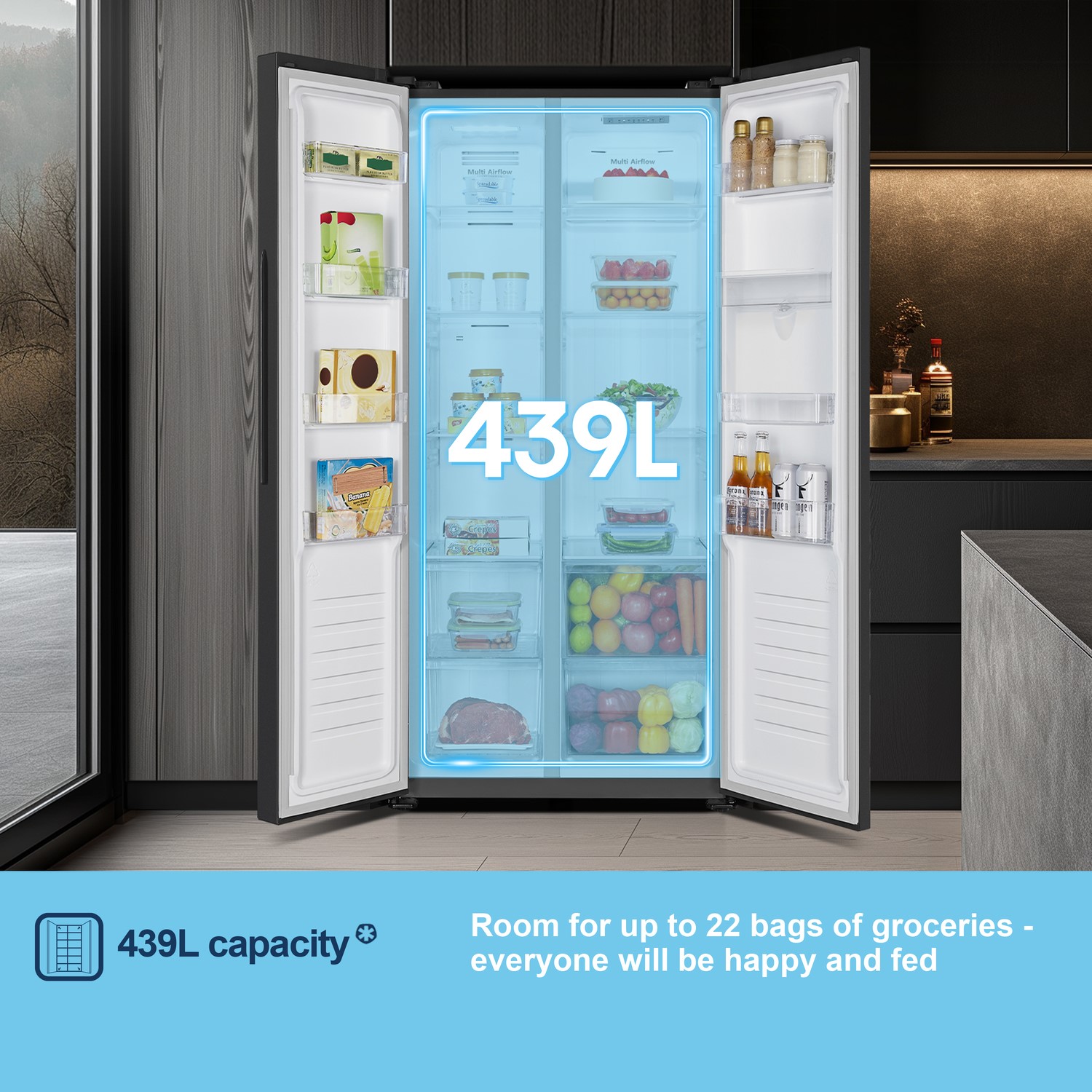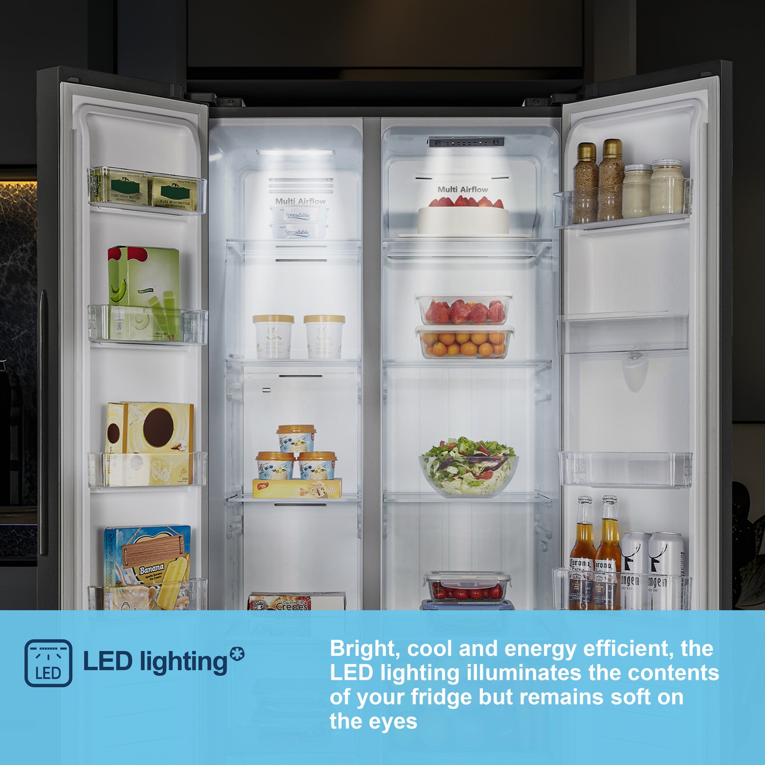 Meet your kitchen’s new best mate - the Fridgemaster American Side-by-Side Fridge Freezer. With room for 22 bags of shopping and chilled water on tap without any plumbing needed, it’s made for busy lives and hungry bellies. No more defrosting thanks to clever Total No Frost tech, and Super Cool and Super Freeze swoop in to keep your food fresh and flavours doing a little happy dance. Quiet, energy-smart, and lit up with bright but gentle LED lighting, it’s packed with handy extras like Holiday Mode to keep things fresh while you’re off sunning yourself. Easy, breezy, and brilliantly brilliant.