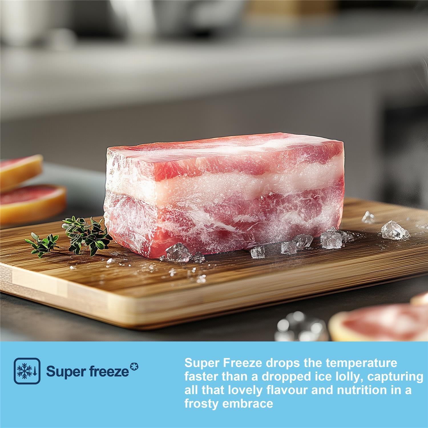 Super Freeze rapidly lowers the temperature and freezes your food much faster than usual.