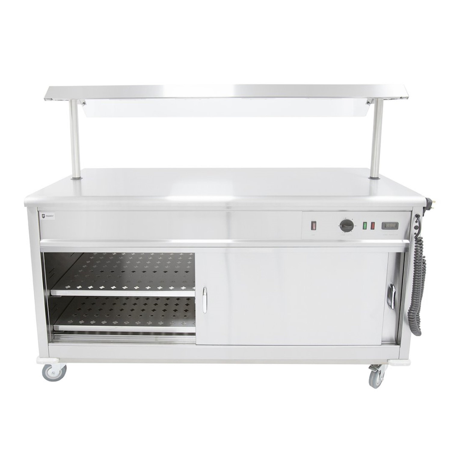 Parry MSF12G Mobile Flat Top Servery Counter And Hot Cupboard With Heated Overhead Gantry. 1305mm Wide. UK Plug. Made In Britain