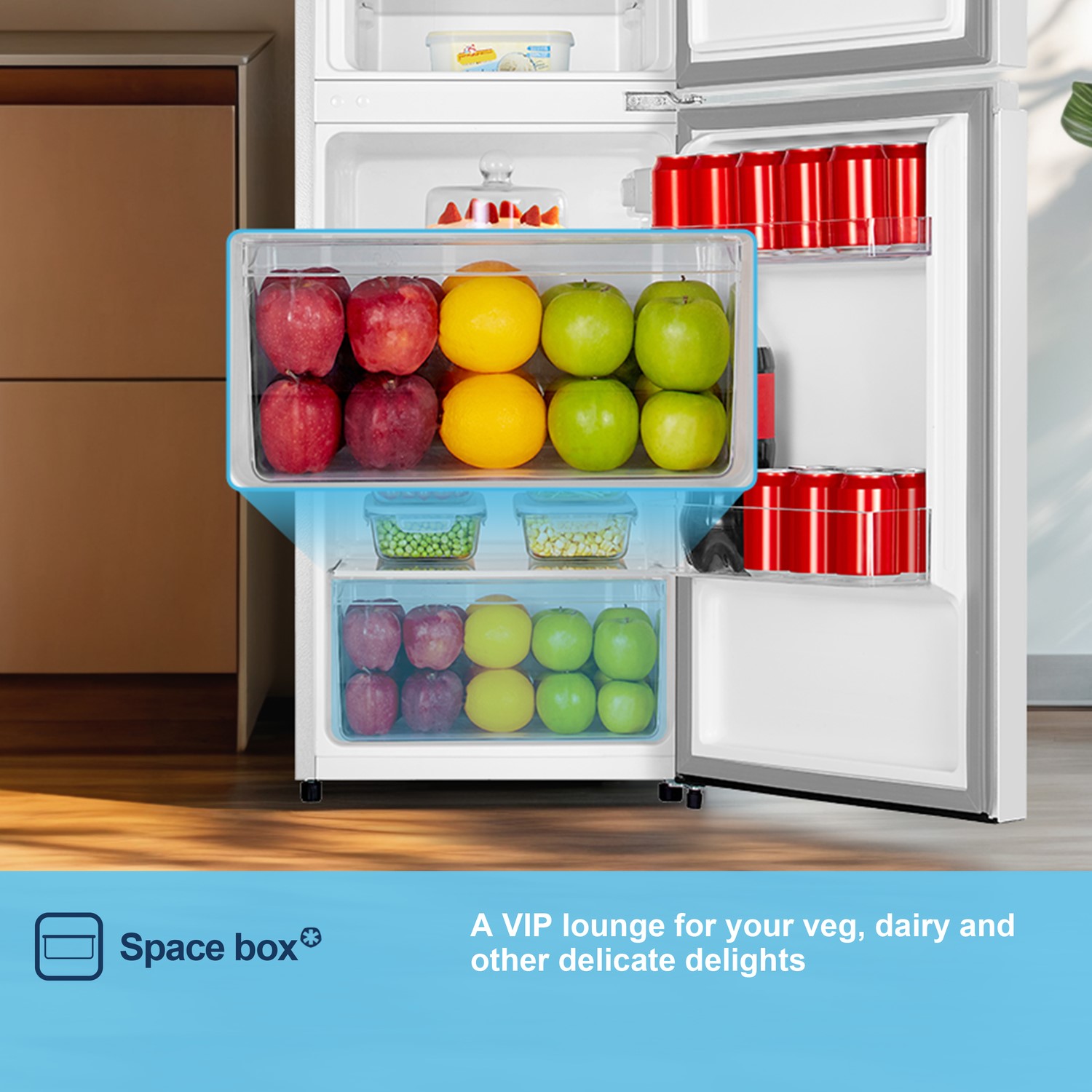 The LED light in the fridge compartment is bright and energy efficient, making it easy to see what is inside.