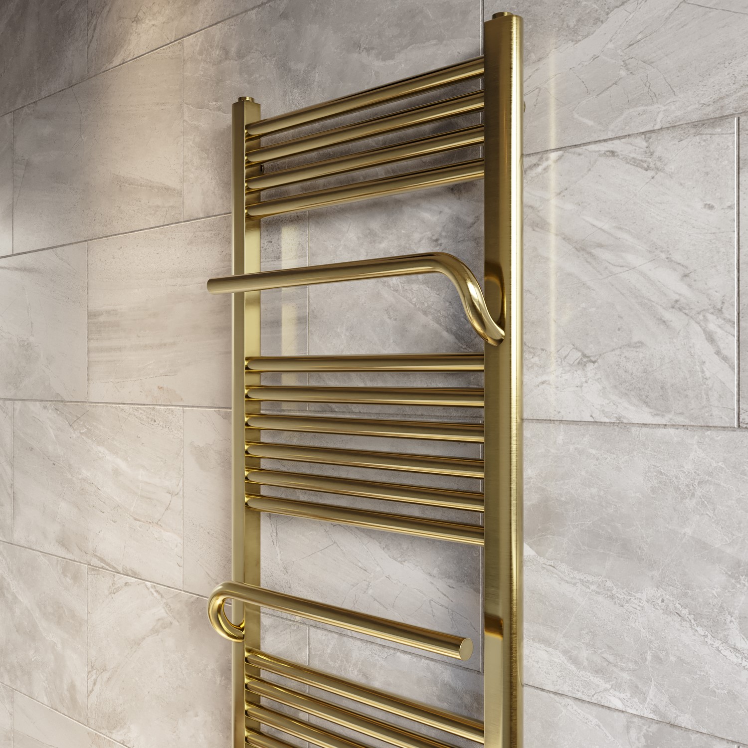 Transform your bathroom with this large brushed brass heated towel rail — a designer central heating radiator that adds both elegance and efficiency to compact spaces. Fuelled by your central heating system, this vertical radiator combines a stylish aesthetic with practical performance. Crafted from durable mild steel with anti-corrosion properties, it’s built to withstand moisture and offer lasting reliability. The towel radiator features 12 rails, plus 2 additional heated towel bars with a depth of 149mm. The bars are designed for hanging and drying two extra towels- perfect for a modern family bathroom.