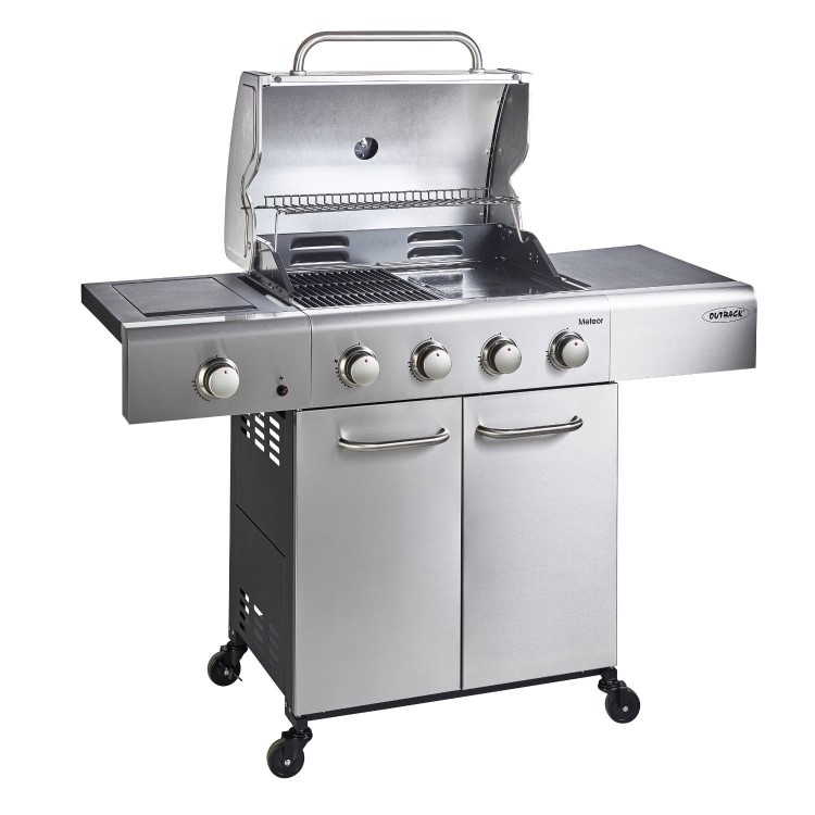 How off your culinary skills with the sleek Outback Meteor stainless steel 4 burner gas barbecue. With built-in storage cabinet and side burner this model also features 4 stainless steel burners, 2 porcelain-coated cast iron grills, flame tamers, stainless steel roasting hood and easy-clean drip tray. Meteor 4 Burner Stainless Steel is supplied with hose and propane regulator.