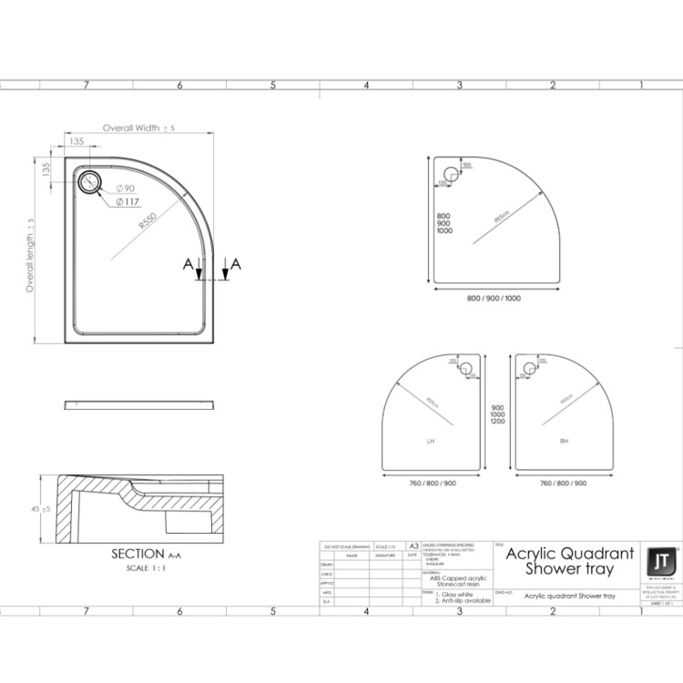 The 900 x 900 quadrant shower tray can be used in the bathroom corner with one of our quadrant shower enclosures, it is lightweight making installation easier. As a result of its durability and stain-resistant characteristics, stone resin is a very popular choice for shower bases. In addition, stone resin retains heat longer, making showering more enjoyable.