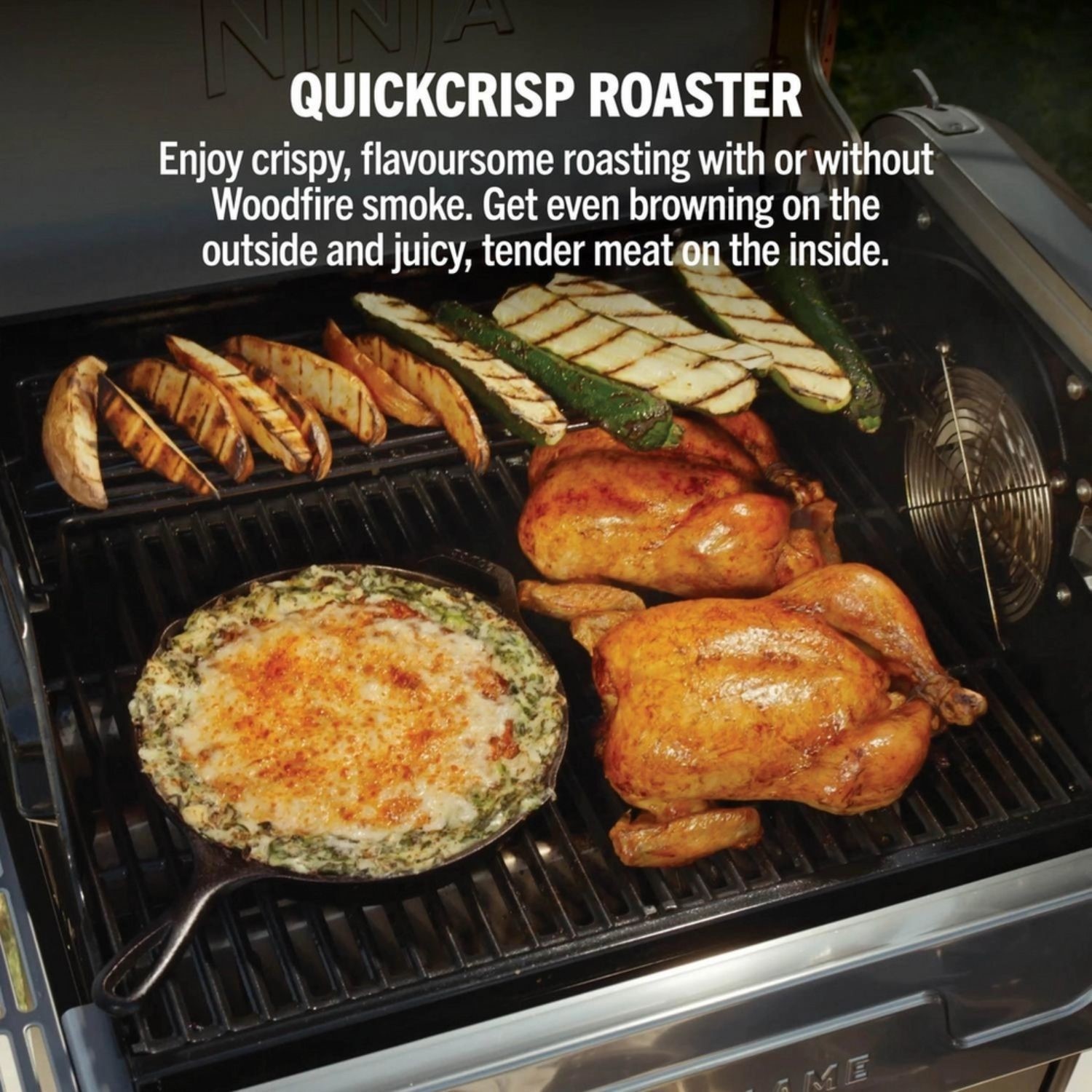At the heart of the FlexFlame is CyclonicHeat-iQ, Ninja’s advanced heat technology that delivers fast, even cooking and rich flavour compared to traditional outdoor grills. It’s made possible with a high-velocity cyclonic fan, which circulates hot air evenly around your food, ensuring consistent results every time—whether you're searing steaks, slow-smoking ribs, or baking a crispy pizza crust.