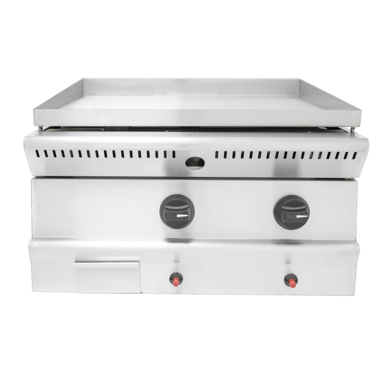 This premium gas griddle is ideal for busy chefs and catering professionals who need a reliable, heavy duty cooking surface as it has a premium grade 10mm thick polished stainless steel cooking surface making it ideally suited for commercial use. With features including top quality powerful burners , piezo ignition and removable waste / fat drawer, it is the perfect choice for everyday grilling. Manufactured in Britain to an exacting standard from high grade robust components, it is designed to withstand long periods of use, whether in a busy restaurant, fast food or café establishment. The griddle has two powerful burners that are independently controlled from each other, allowing you more versatility to heat two separate sections at once, at different temperature levels and giving precise heat management across different sections of the cooking surface. This level of control is vital for maintaining consistent cooking quality, especially when preparing various dishes at once. Additionally, the griddle’s grease management system ensures easy clean up and maintains a hygienic cooking environment by efficiently channeling grease away from the cooking area.