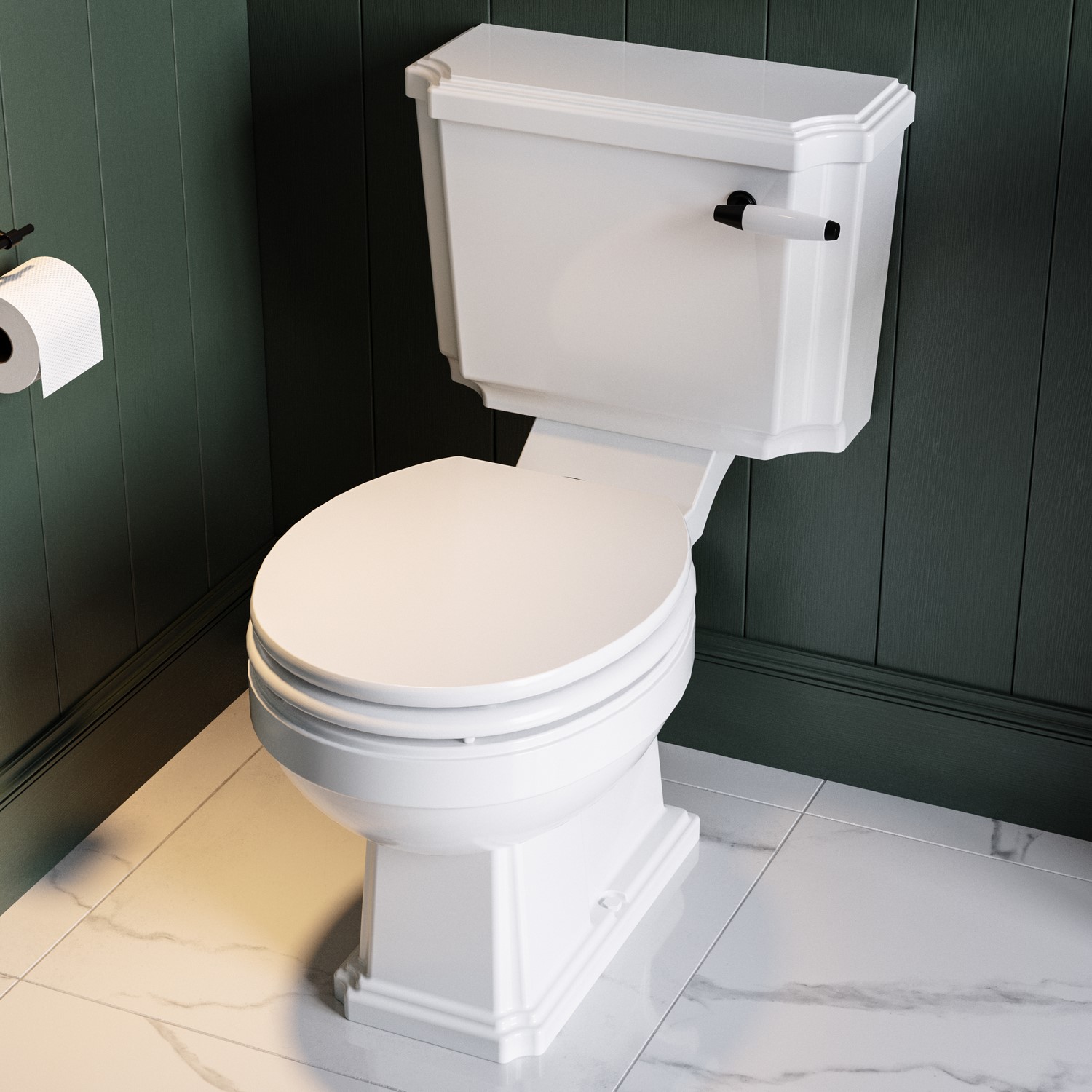 Matt Black Hinge Covers: Stylish black accents offer a contemporary contrast to the white seat, perfect for modern bathroom settings.