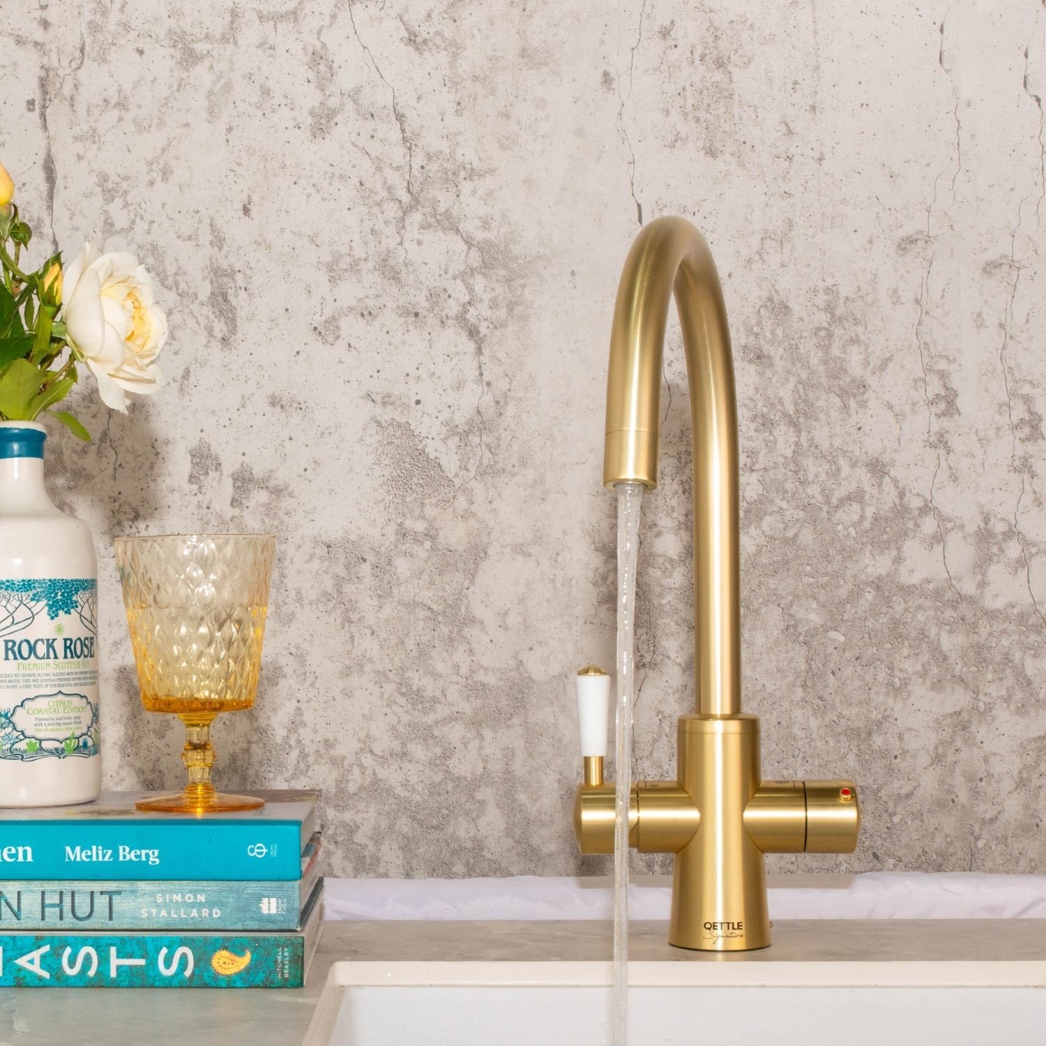 QETTLE Signature Classic 100°C 4 in 1 2L PV - Brass with one lever, button handle offers true, 100°C Instant truly boiling water for making hot drinks, snacks on the go and filling pans when cooking. Alongside your filtered drinking water, plus hot and cold flows.