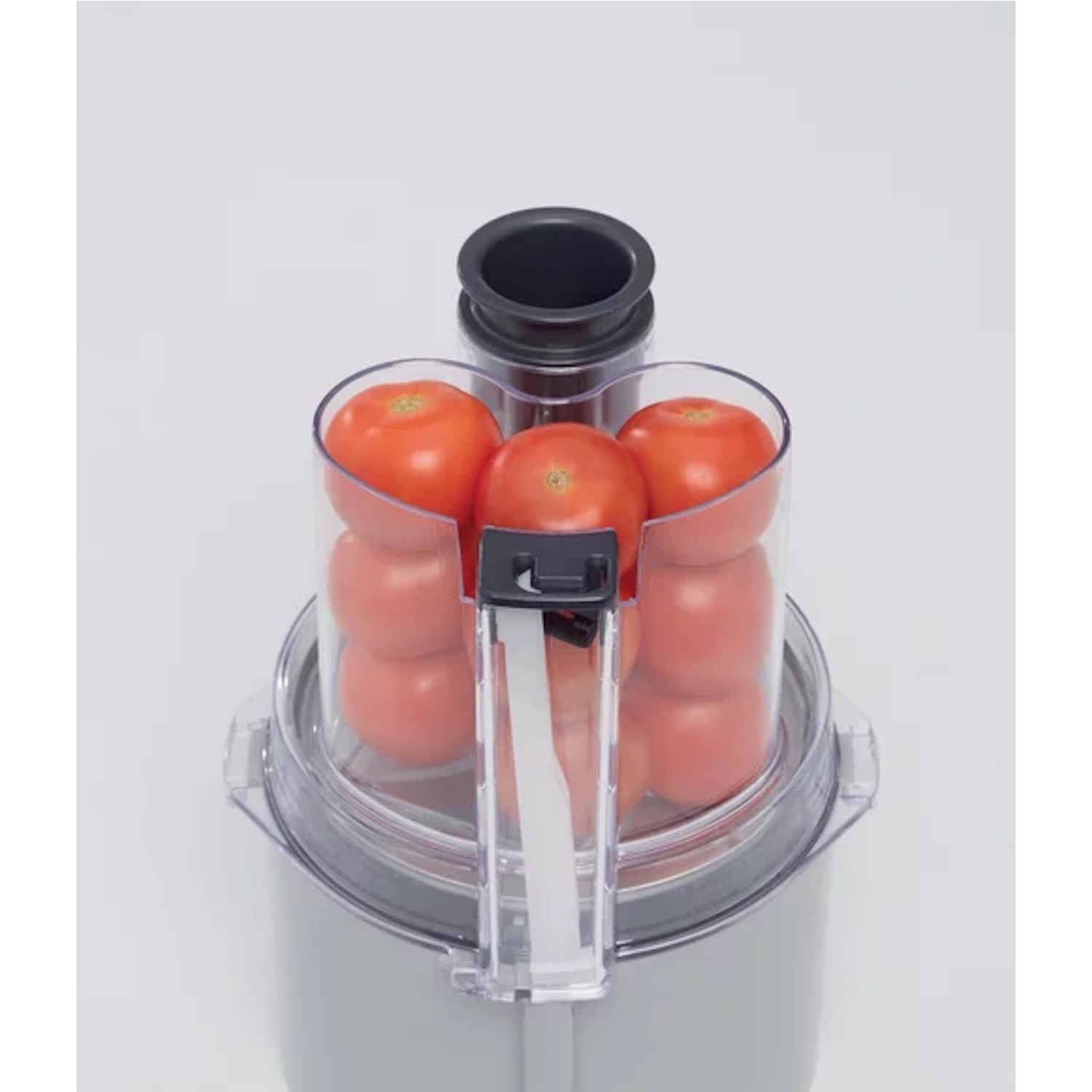 The unit includes a magnetic safety system and motor brake to prevent operation unless the lid is securely locked, ensuring operator safety. It is supplied with a standard 13 A plug for immediate countertop use without hardwiring. Two hoppers accommodate different food prep needs: a large kidney-shaped hopper for bulk items and a cylindrical Ø 58 mm hopper for uniform cutting of long vegetables.