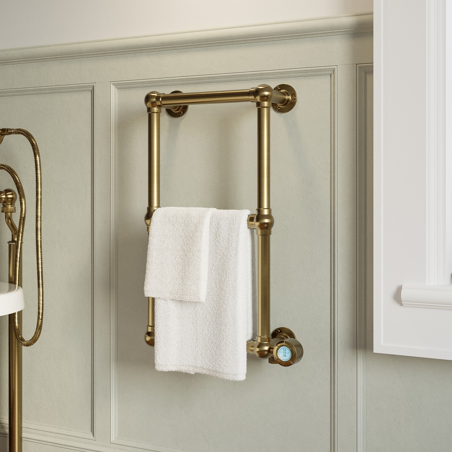 The three-bar design with a brushed brass finish and a matching control panel to give it all in one look makes an eye-catching statement in any bathroom and adds to its aesthetic.