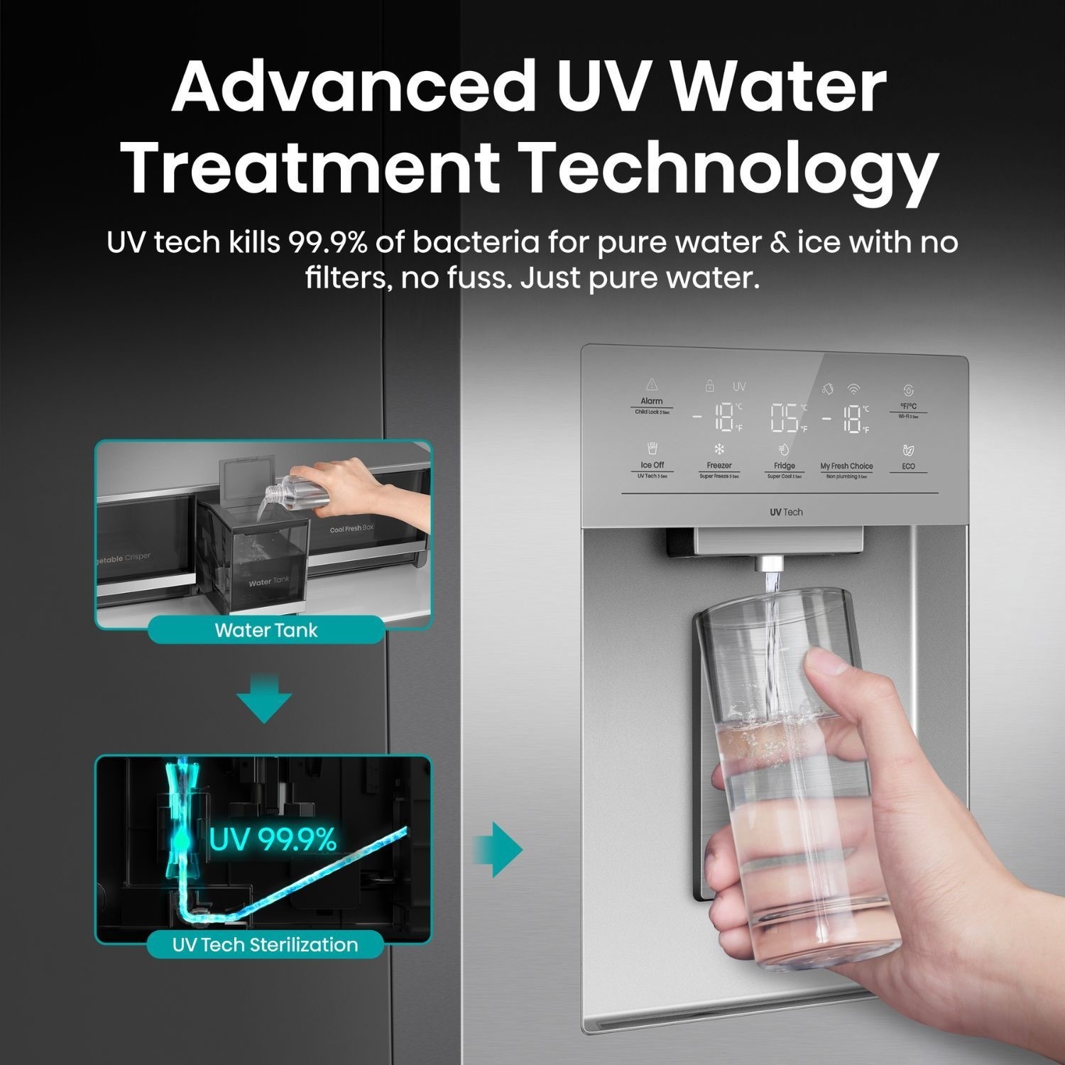 Hisense’s UV Water Dispenser sterilisation tech removes 99.9% of bacteria no filters needed. Enjoy safe, pure water and ice every day, straight from your fridge to support your healthy lifestyle.