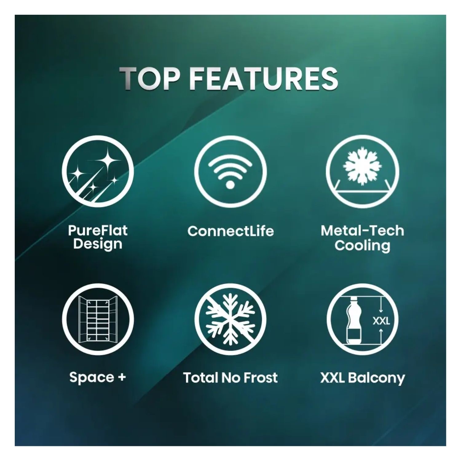 Inside, the Space+ XL-capacity ensures there’s room for every shop, occasion, and celebration. With its spacious side-by-side design, organising food is effortless—whether it’s fresh produce, weekly essentials, or party platters, everything has a place and is easy to reach. The XXL Door Balcony adds even more flexibility, making it ideal for larger bottles, cartons, or bulky items.