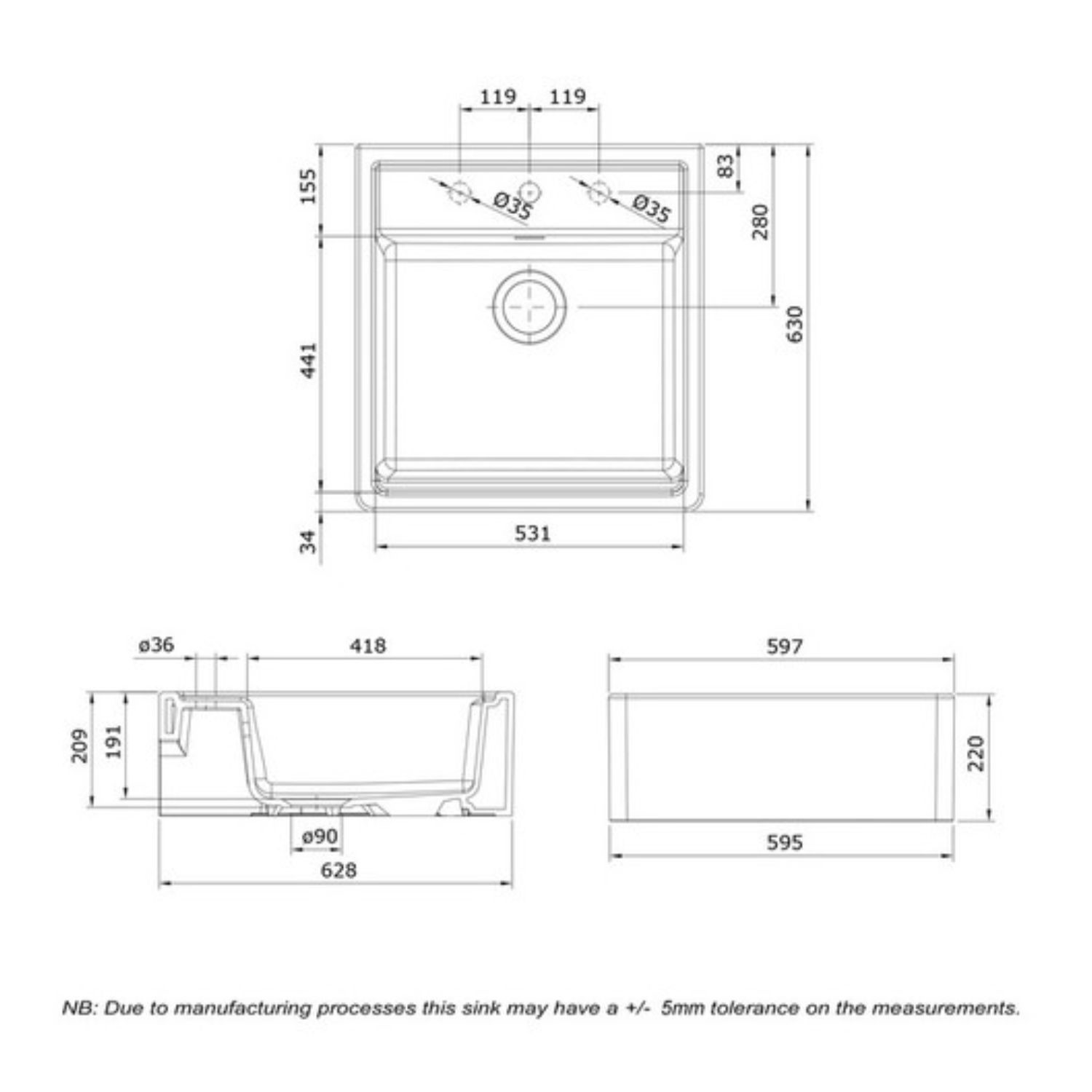 - Sink depth (front to back): 597 mm