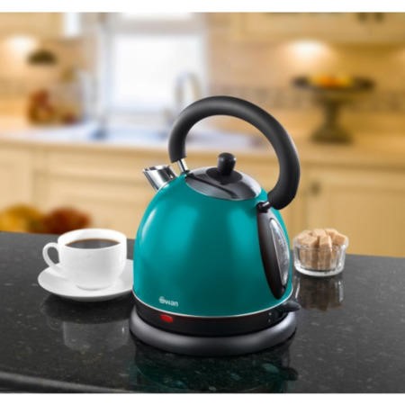 Swan 1.7 litre traditional teal kettle with black and stainless steel accents on 360 degree base. Featuring automatic cut off and safety lockin lid with boil dry protection. A stylish accessory for any kitchen.