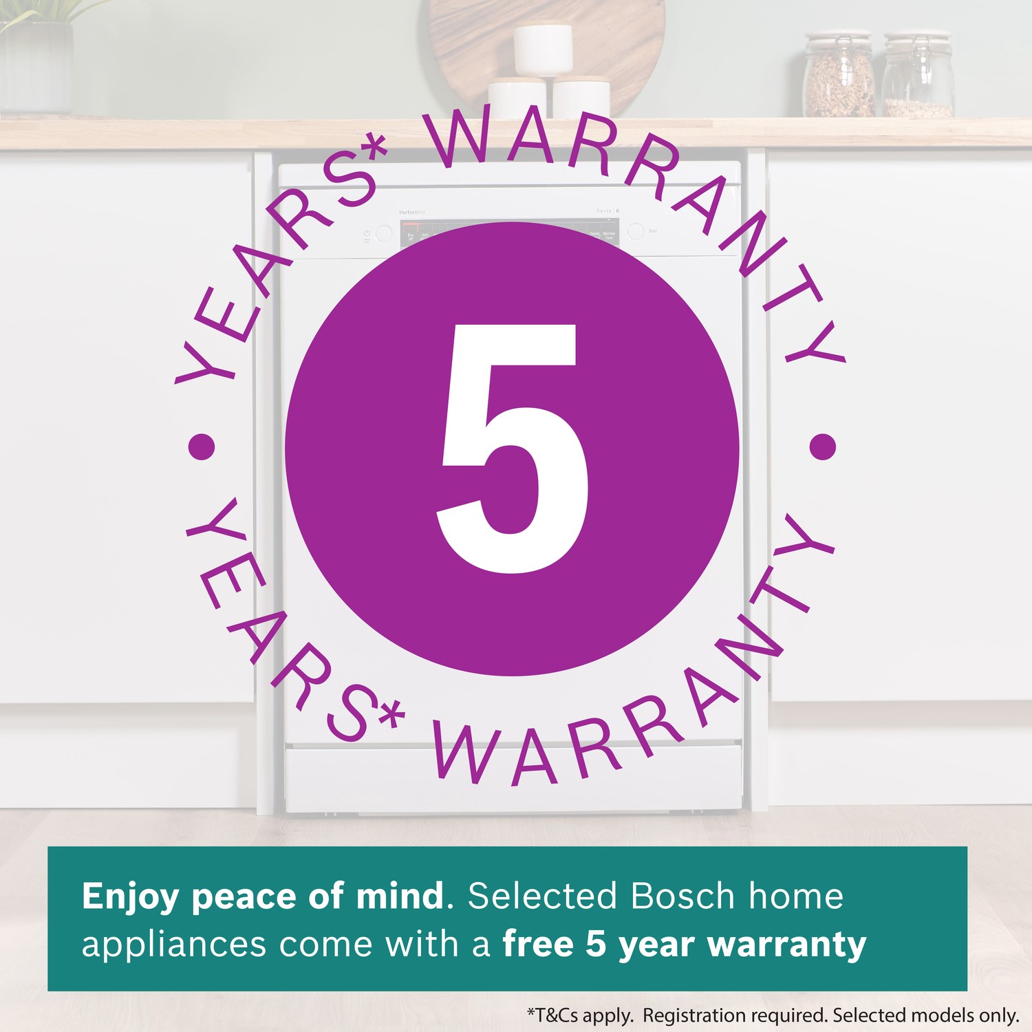 This Bosch Series 6 dishwasher is designed for easy living. The flexible VarioDrawer and VarioFlex baskets mean you can fit all sorts of items, big or small, while the Triple Rackmatic system lets you adjust the top basket even when it's full. Plus, it's B-rated for energy efficiency, helping you save on bills. With AquaStop protection for peace of mind and a 5-year warranty, this reliable quiet dishwasher takes the hassle out of washing up.