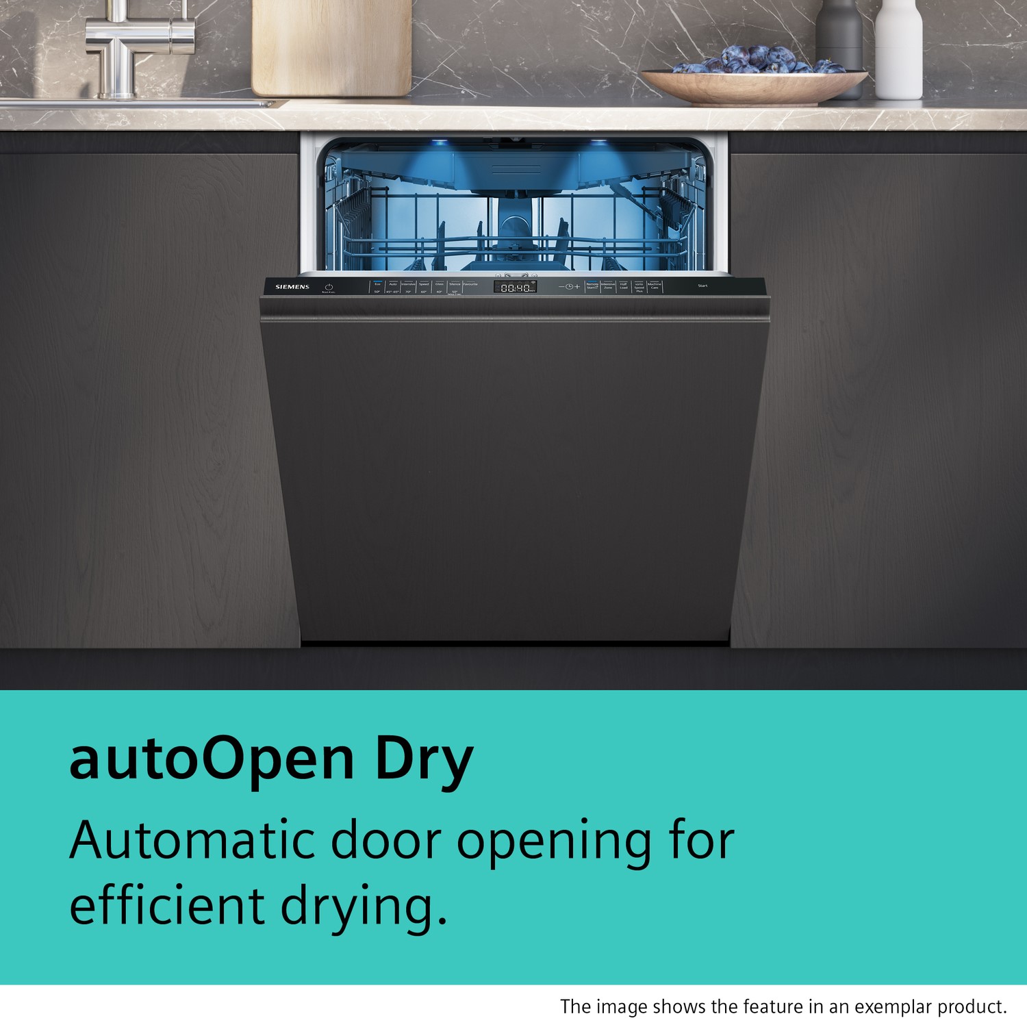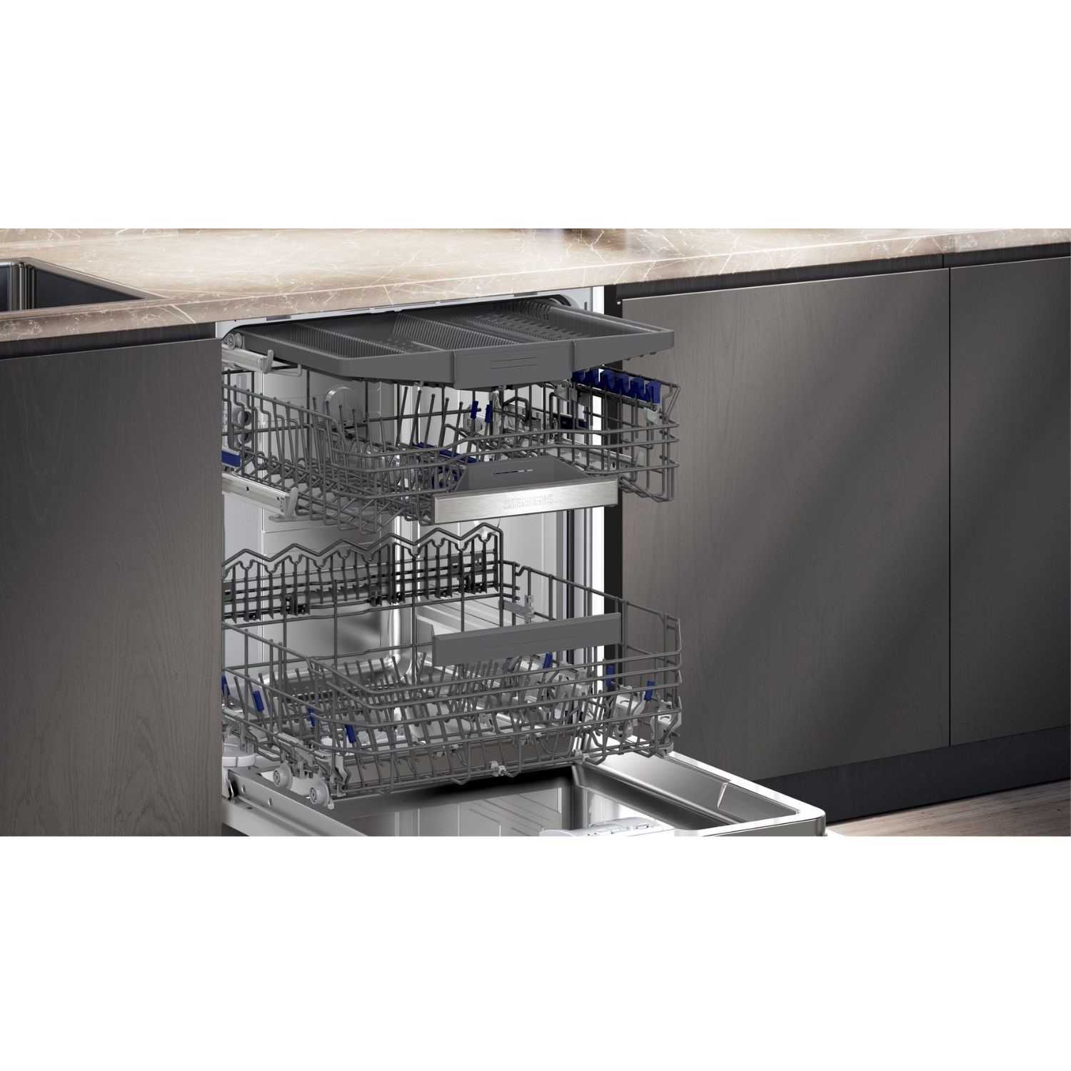 Upgrade your kitchen with the Siemens SN95EX12CG iQ500 fully integrated dishwasher. It's designed to make life easier, fitting up to 14 place settings – perfect for busy families or when you have guests. You'll save money on bills thanks to its top A-rated energy efficiency, and with smart Wi-Fi, you can control it from your phone, wherever you are. Need dishes clean fast? varioSpeed Plus gets the job done quicker, while autoOpen dry means your dishes come out perfectly dry, every time.