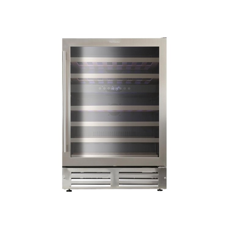 The Montpellier WS46SDX wine cooler is a classic addition to any home or utility room providing a chilled home for the wine bottles you can't seem to make room for in your cupboards or that take up too much space in your fridge. This model holds up to forty six* × 75cl Bordeaux style bottles of wine at a temperature that can be set at upper zone 2°C to 12°C, lower zone 12°C to 20°C. It features telescopic beech shelves, and blue LED lighting. Control the temperatures by using the touch control panel. It also features a handy button lock to stop the temperature being altered by mistake.