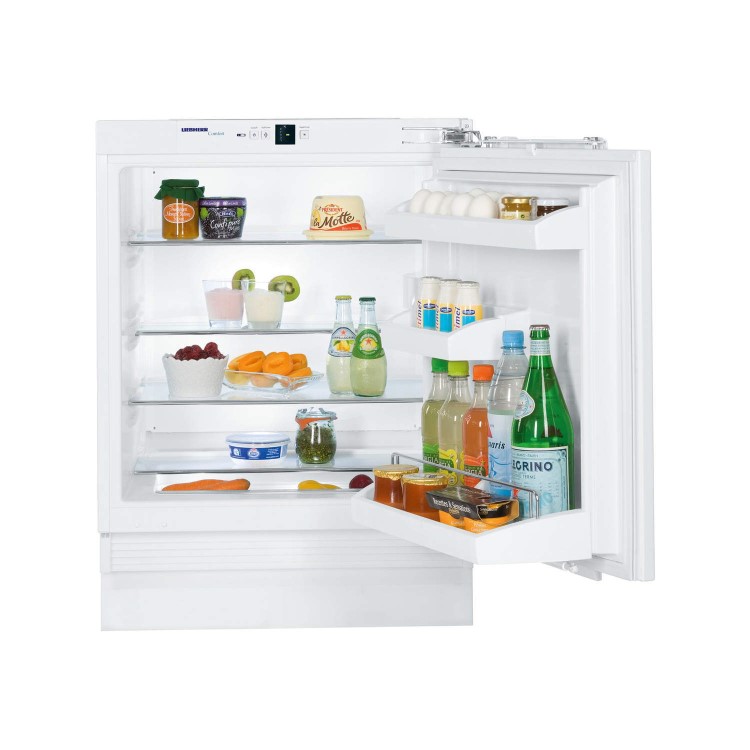 Goods can be stored in two rows in the extra-deep bottle rack of the UIK models. For example, tall bottles in the rear row, and preserves or small pots of yoghurt at the front. Both rows are securely separated by an end-to-end rail. A re-positionable bottle holder keeps the bottles securely in position.
