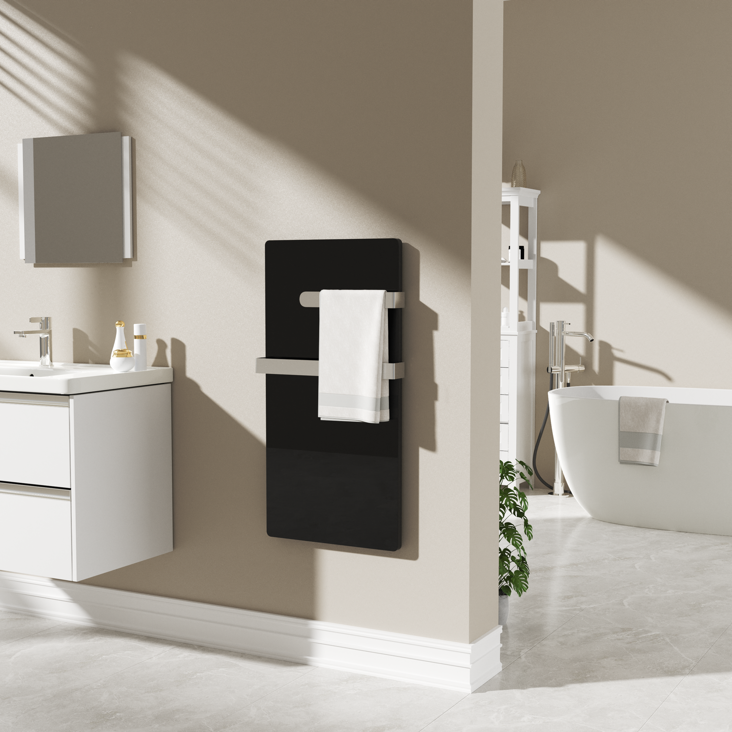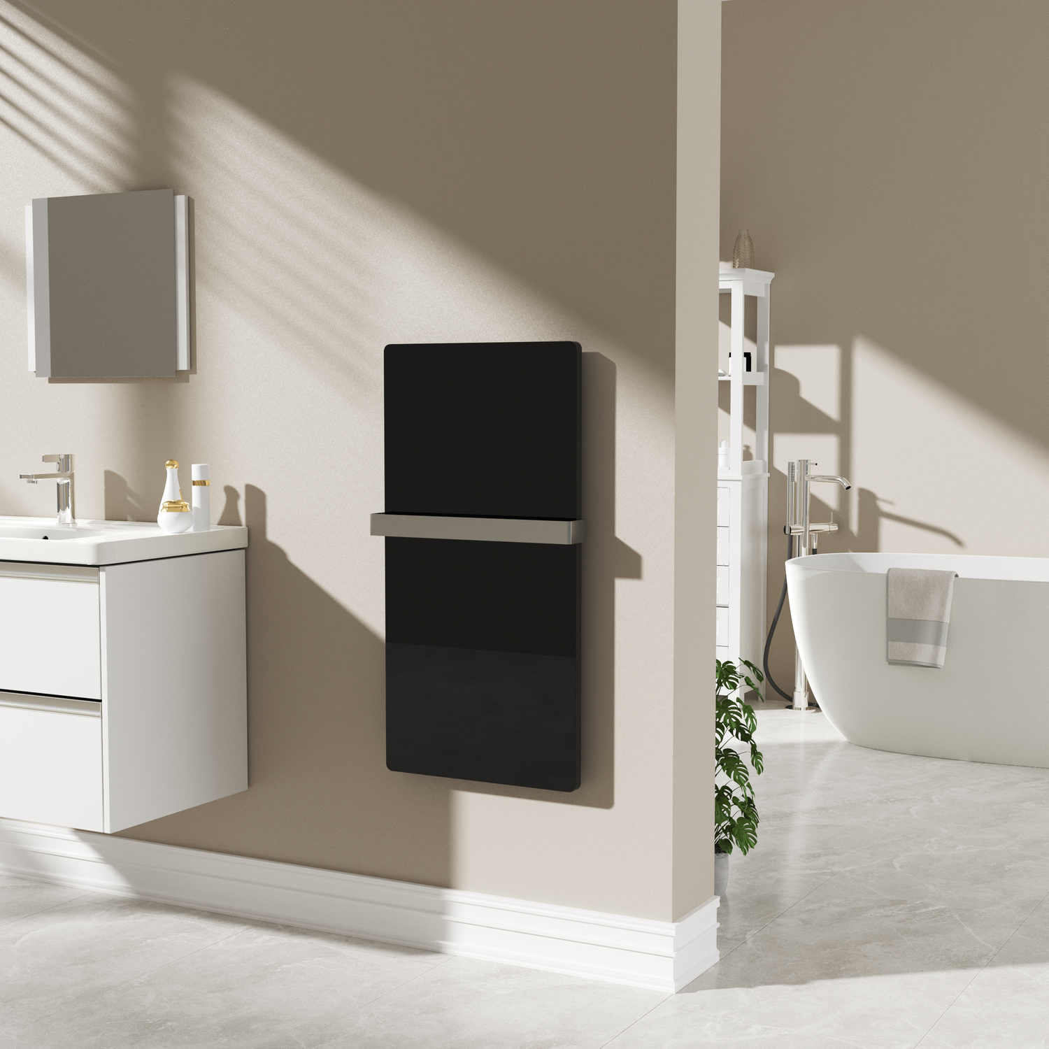 This designer infrared glass heater is a sleek, stylish and space-saving alternative to traditional form forms of heaters. Cleverly designed, the vertical heater also has a removable towel rail making it great for narrow spaces and bathrooms but its tempered glass design stands out in any room. This glass heater uses harmless infrared rays to heat objects directly, rather than warming the air like most common radiators, creating a long-lasting natural warmth that you feel the moment you switch on the panel. Heat is then released slowly and evenly back into the room over time from the towels, walls and floors, eliminating any hot and cold spots in the process. It is installed vertically and sits very close to the wall, taking up very little room space. There's no moving parts or pipework required, just an electricity supply, making it more reliable and less prone to break.