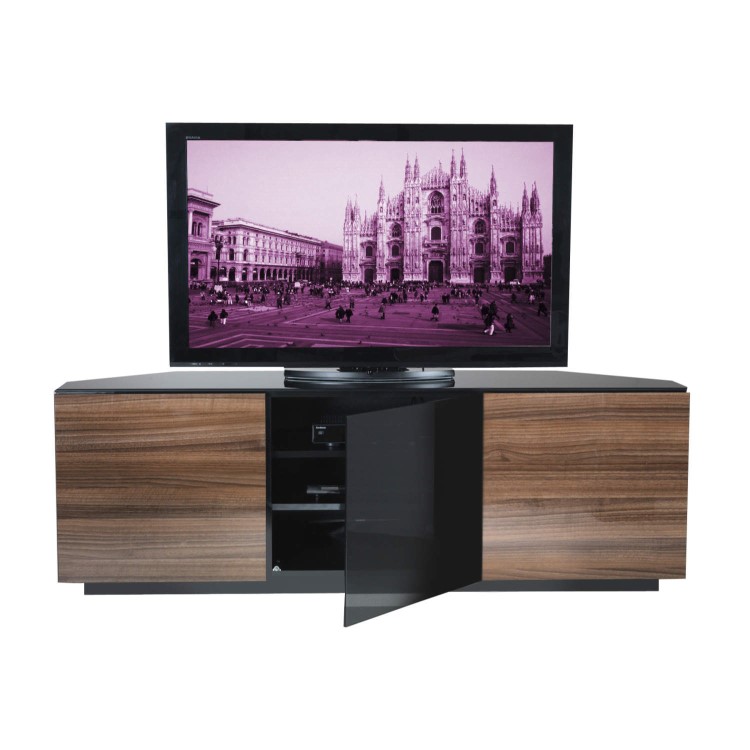 The stand also features a smoked black glass top surface which sits above 2 Walnut gloss fronted side cupboards which hide adequate shelving, ideal for storing your DVDs or any home entertainment equipment. A central set of shelves sit behind a glass door and a practical cable management system complete the stylish design.