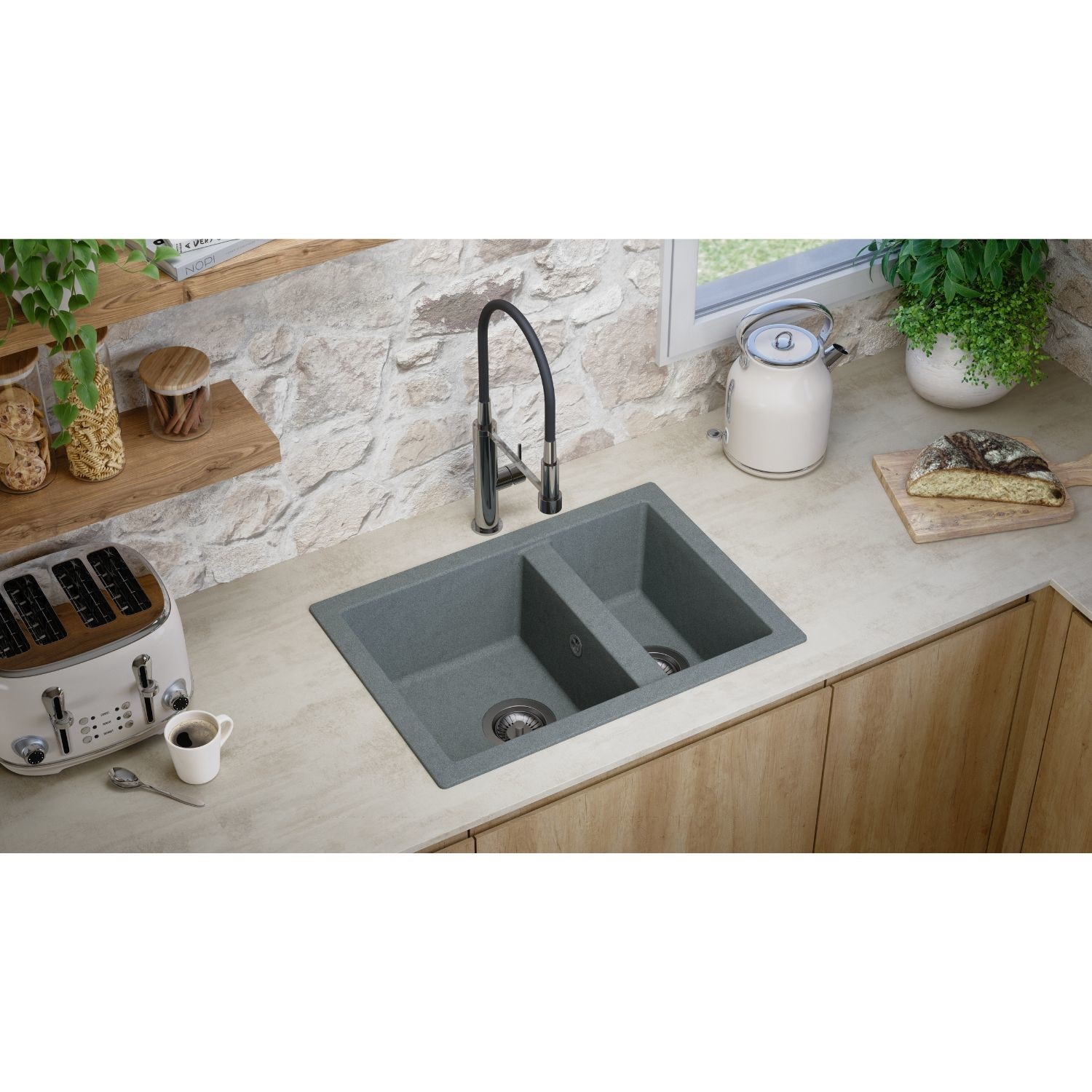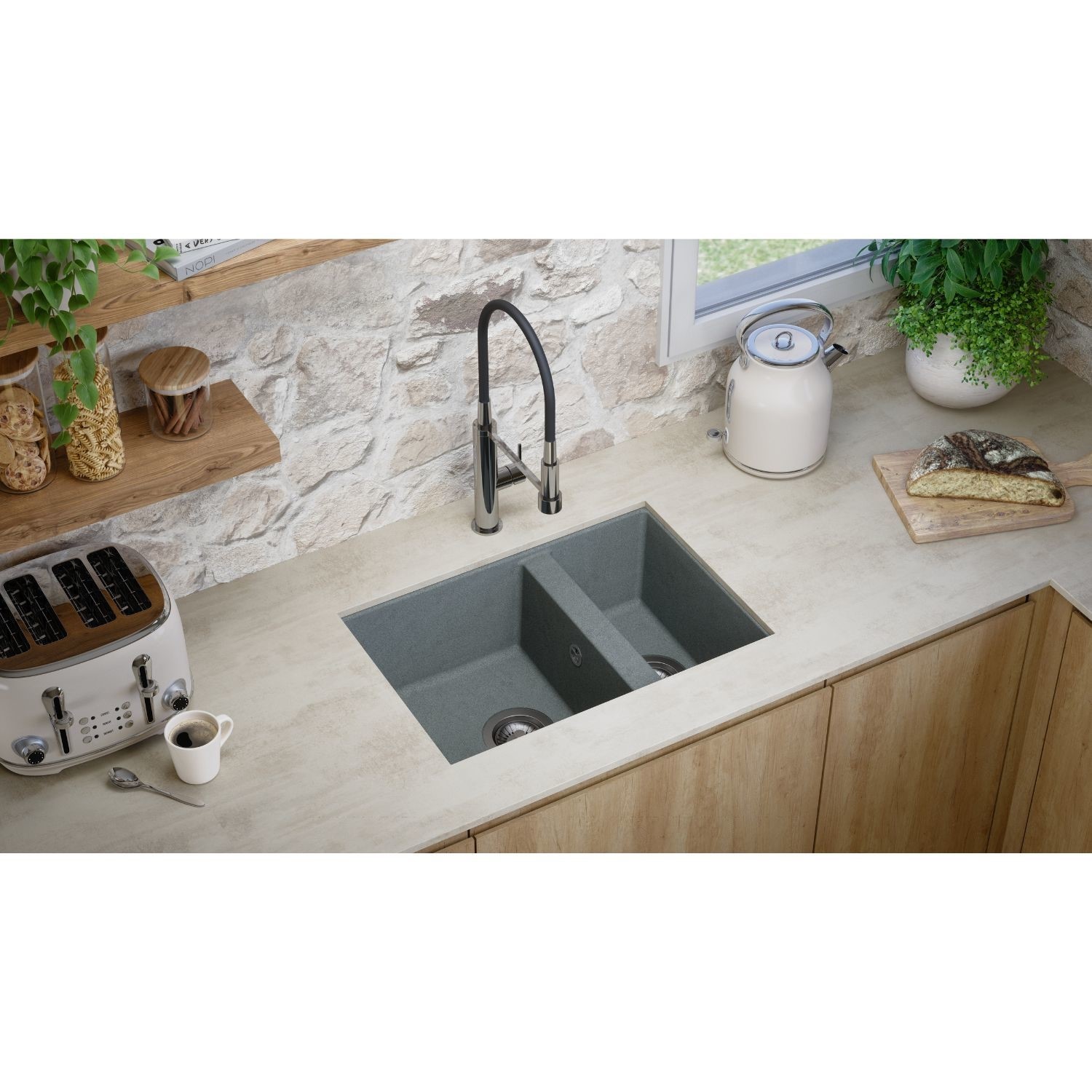 Upgrade your kitchen with the Weston 1.5 Bowl Grey Composite Sink from RockLite. Suitable for both inset and undermount installation, this sink is lightweight, features a powder in mold coating (PMIC), and provides increased resistance to shocks, heat, and impacts for long-lasting performance. The 1.5 bowl design offers convenience for everyday kitchen tasks, providing a separate smaller bowl for rinsing or prepping. Comes with a complete waste kit and a 10-year warranty for peace of mind.