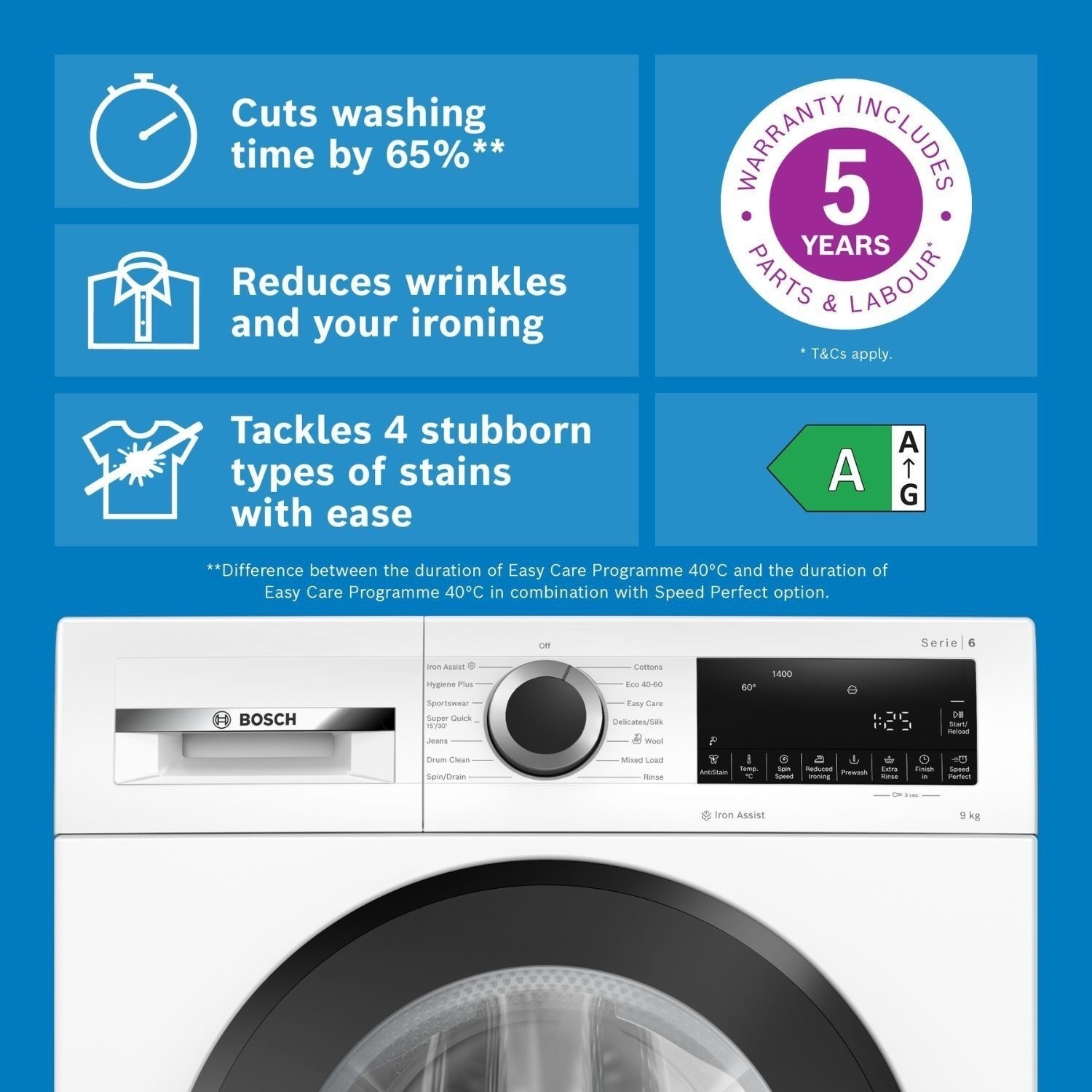 Short on time? Speed Perfect cuts your wash cycle by up to 65% without losing cleaning power. Your clothes get thoroughly clean, fast, with most programmes and any load size. Spend less time on laundry, more on you.