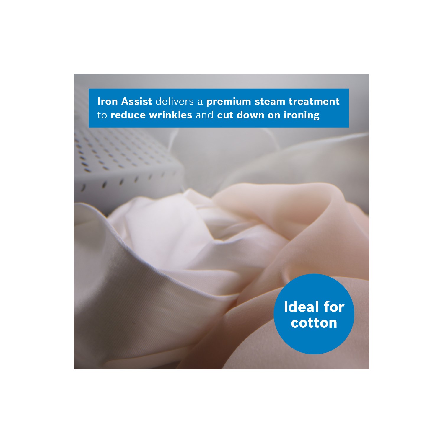 Cut your ironing pile with Iron Assist. Gentle steam reduces wrinkles on washed or dried items in just 20 minutes, making ironing quicker. It also refreshes worn clothes, so they're ready to wear again without a full wash.