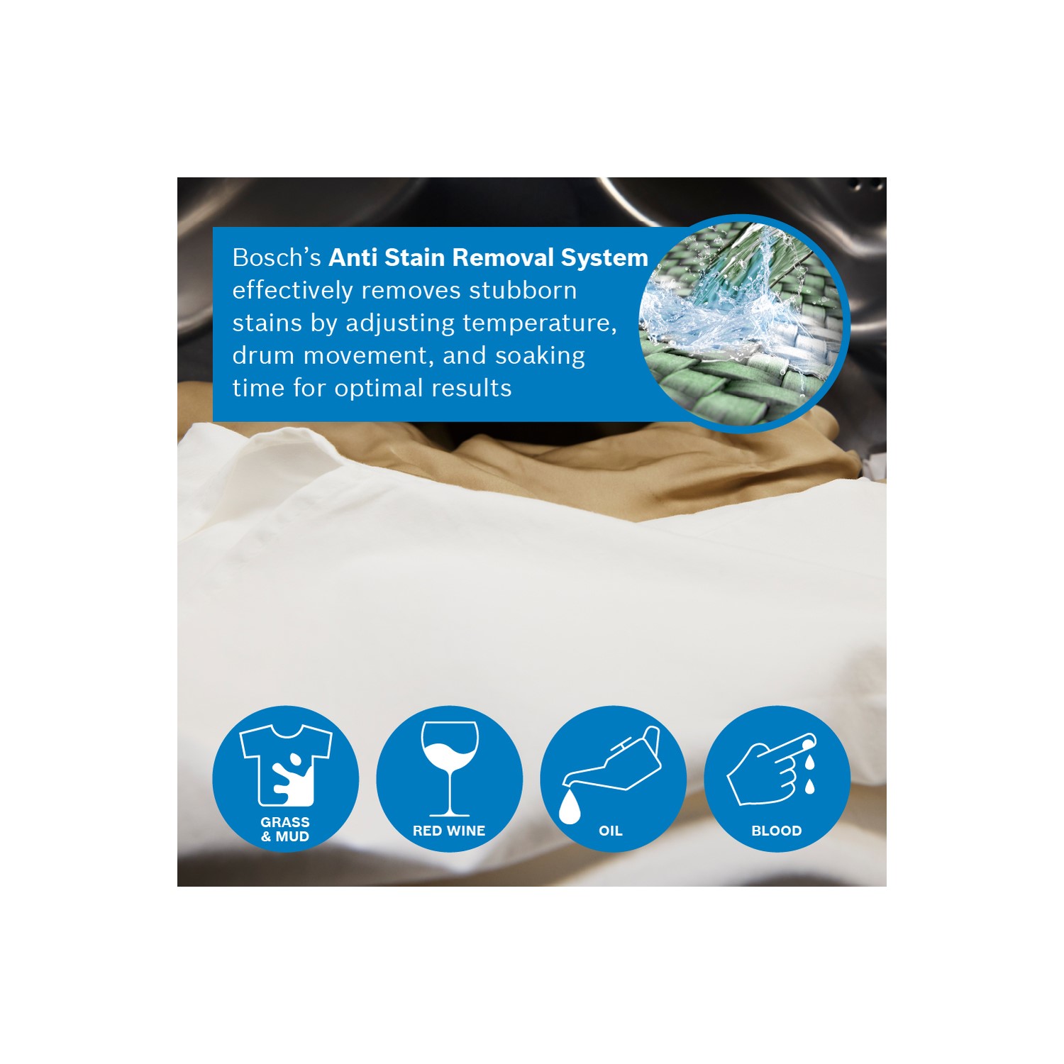 Say goodbye to stubborn marks with Anti Stain. This system automatically tackles four tough stains – like oil, grass, red wine, and blood. Your machine adjusts settings to lift them with ease. No pre-scrubbing; just load your laundry for spotless results.