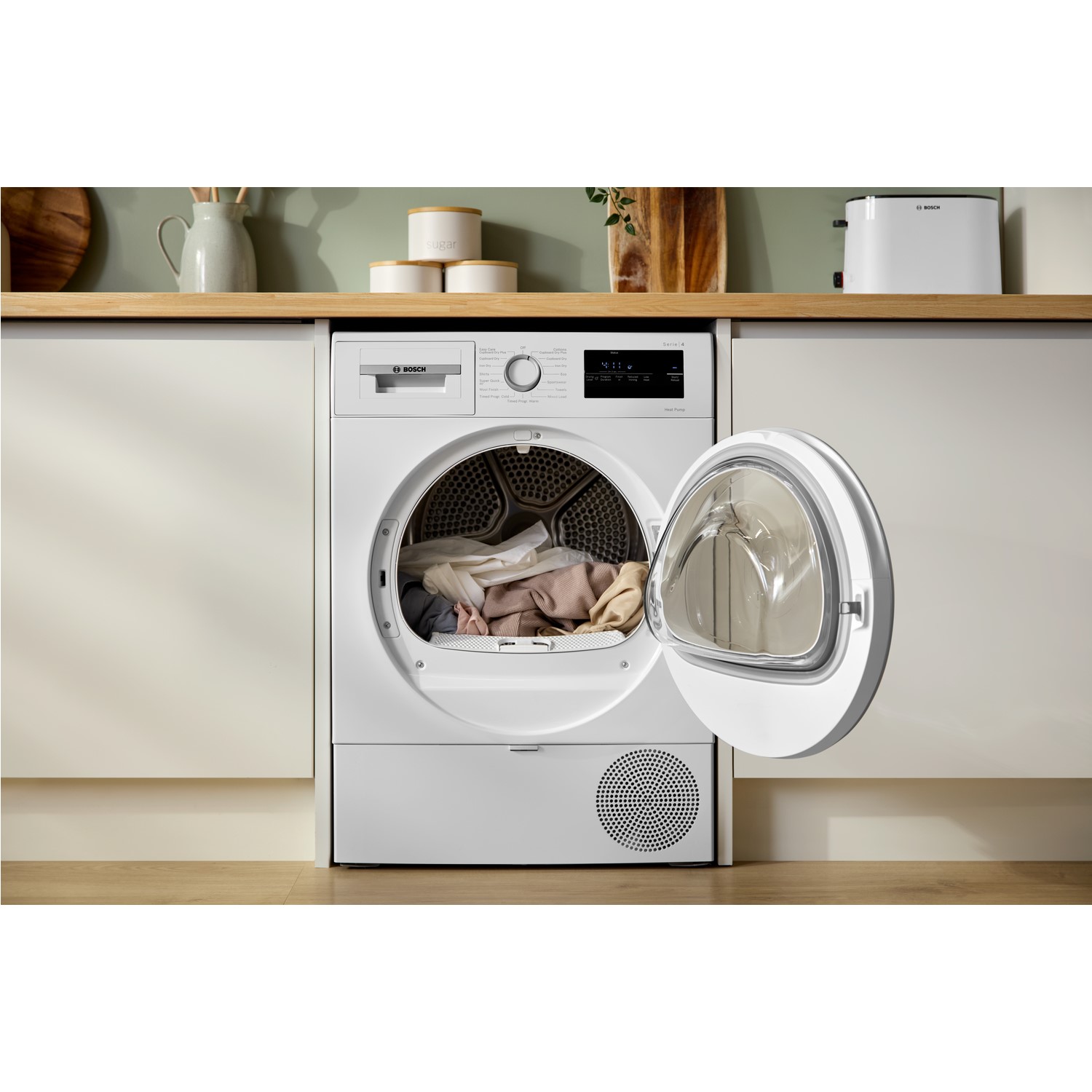 The Bosch Series 4 WTH85226GB Heat Pump Tumble Dryer is an energy-efficient A++ dryer that uses clever heat pump technology to dry your clothes gently while keeping your electricity bills low. Its large 8kg drum capacity means you can dry more in one go, perfect for busy family homes. Plus, the Anti Vibration Design ensures it runs very quietly, so you can get on with your day without noise.