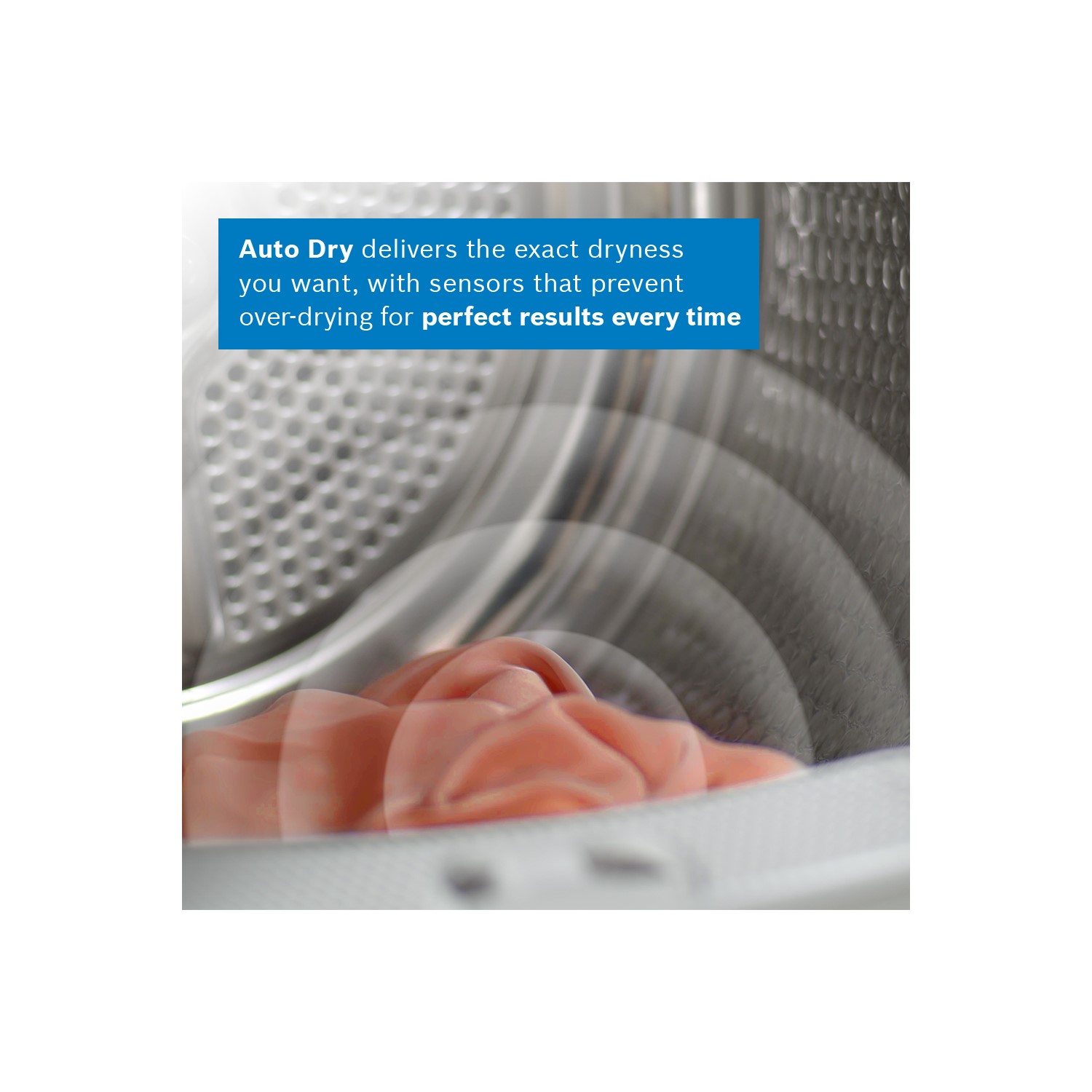 Ensures perfectly dry results. Load clothes in your dryer and Auto Dry will finish it to the exact level of dryness you want, from dry enough to iron to wardrobe dry. Sensors constantly measure heat and moisture to protect your clothes from high temperatures and overdrying. Get the perfect dry every time.