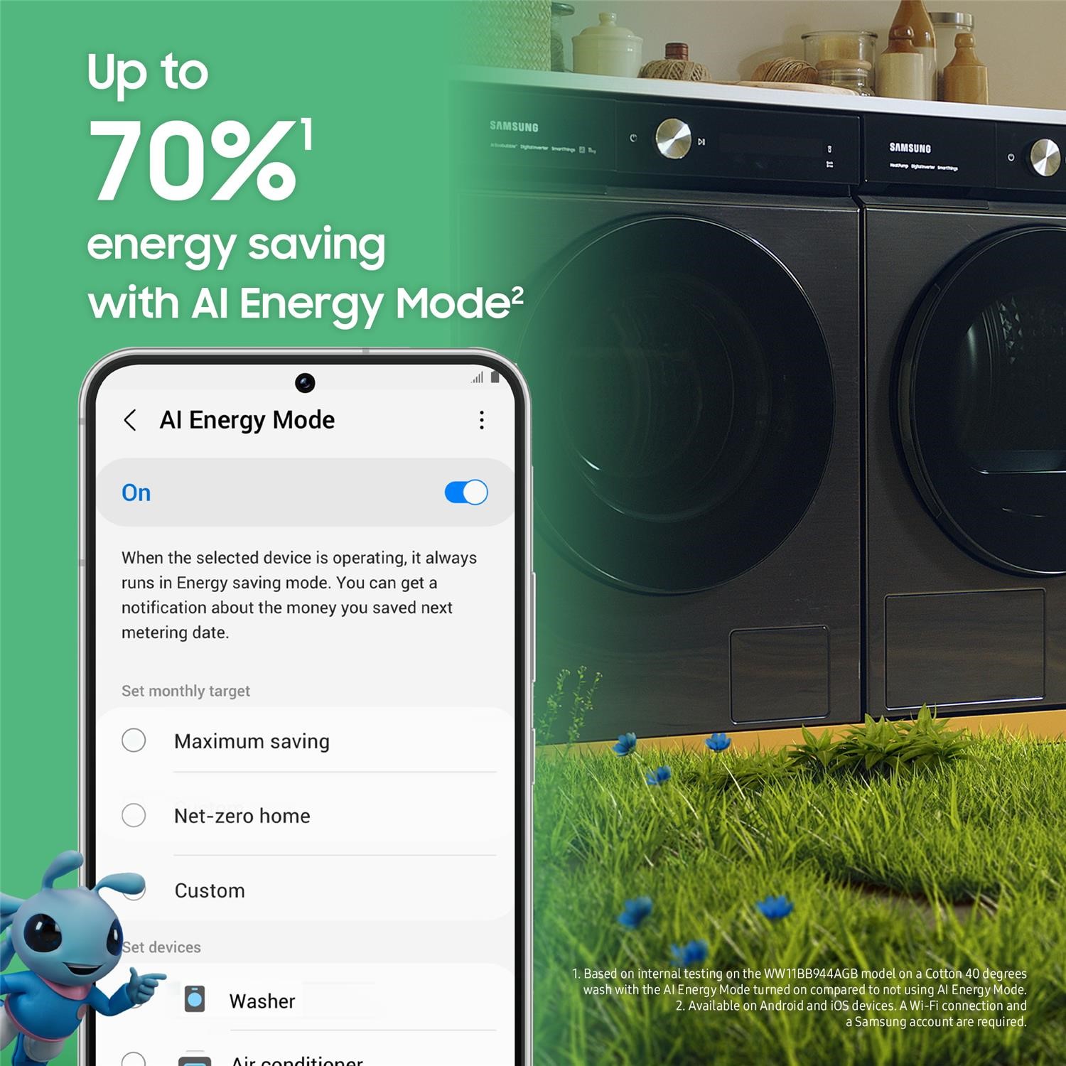Monitor and reduce the washer’s energy use. AI Energy mode lets you check the power consumption and estimates your electricity bill. For courses that operate in AI Energy mode** it reduces energy use by up to 70% using Ecobubble™ to wash with cool water instead of warm and extra cycle time.