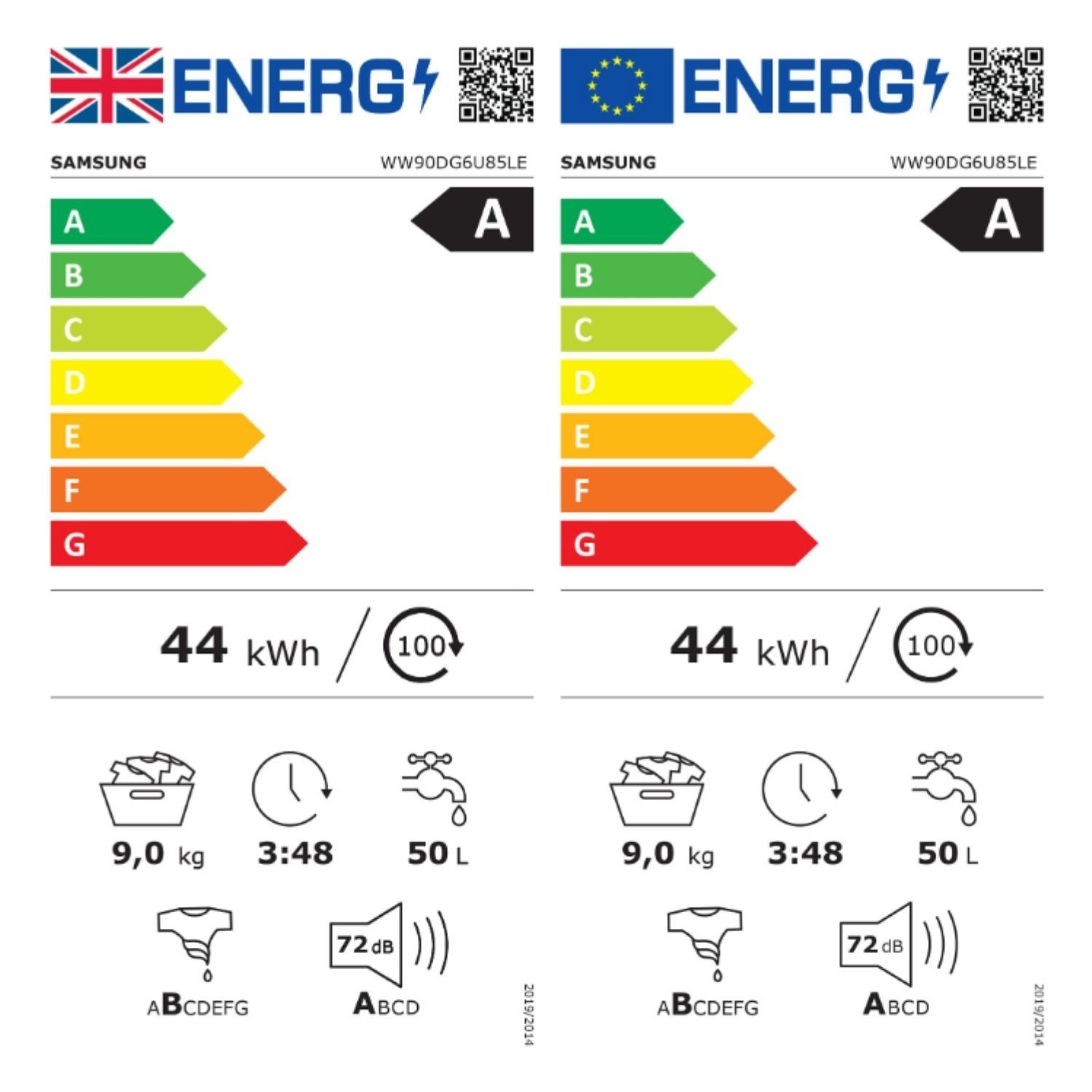 Wash clothes using less energy. The Samsung washing machine is highly energy efficient and even exceeds the minimum energy efficiency requirements for the Class A rating by up to 10%*. Advanced technologies enhance the washing performance and reduce the wash time, which reduces its energy use.