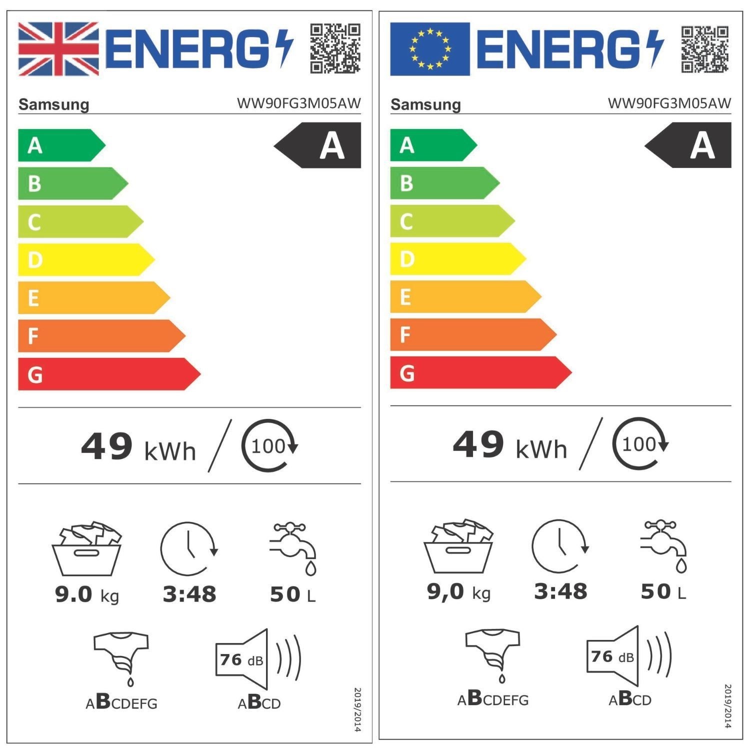 Make laundry day effortless with the Samsung WW90FG3M05AWEU Series 4 freestanding washing machine. This reliable 9kg capacity washing machine is perfect for large, busy families, allowing you to tackle bigger loads in fewer cycles. With its top-tier A-rated energy efficiency, you can enjoy a powerful clean while keeping your electricity bills low.