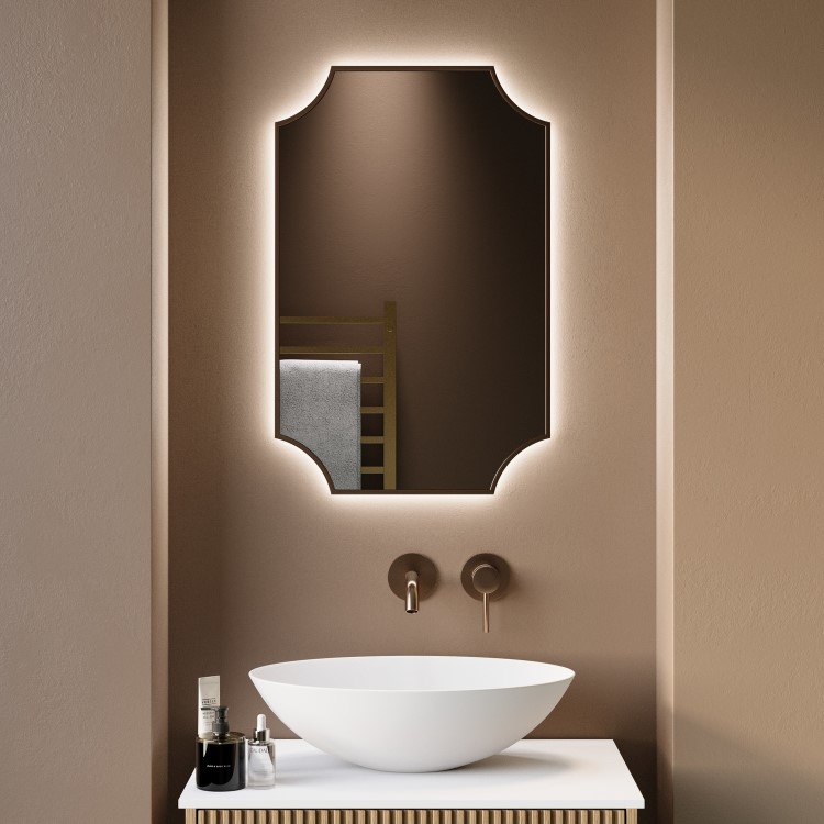 The backlit LED lighting softly outlines the mirror’s silhouette, enhancing its shape and adding a gentle, ambient glow that creates depth and sophistication in any bathroom setting.